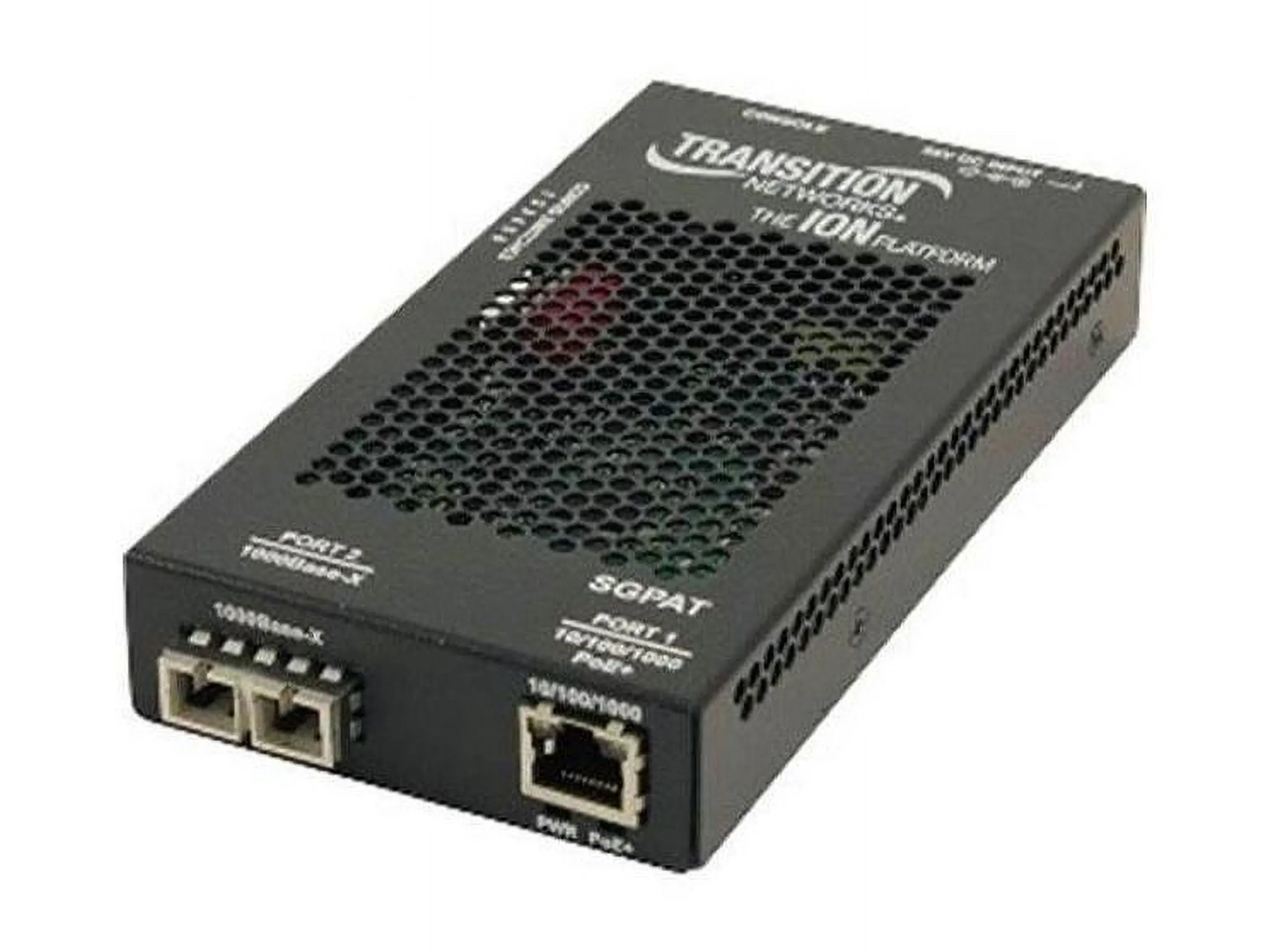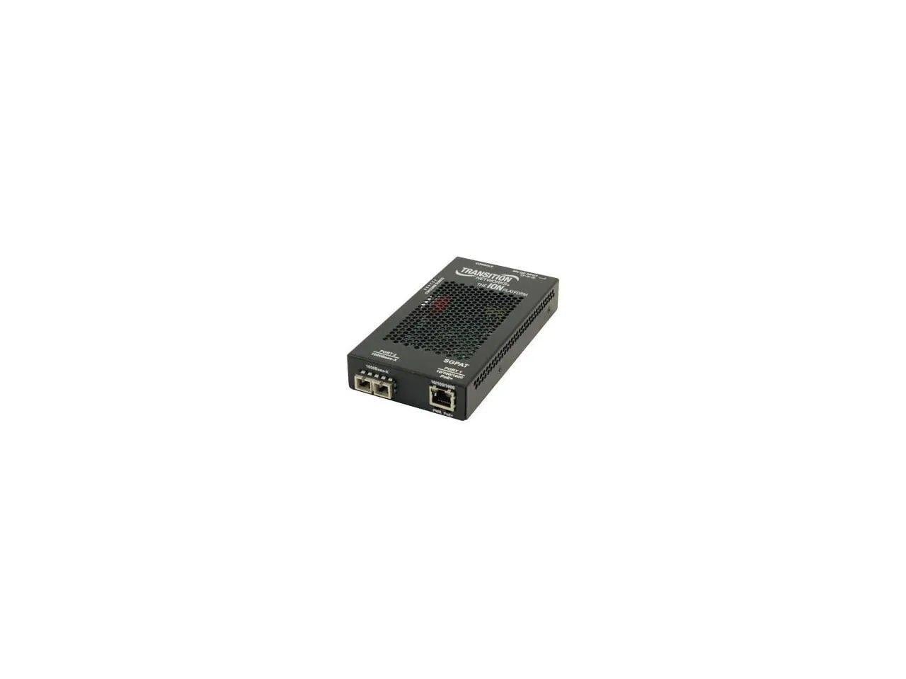 The Transition Networks PoE+ Stand-Alone Ethernet Converter is designed to deliver power and data simultaneously over an Ethernet cable. With its advanced fiber media conversion capabilities, it supports both 10Base-T and 1000Base-SX standards, making it versatile for various networking needs. This converter features an RJ-45 to SC multi-mode connection, extending reach up to 1800 feet at a wavelength of 850 nm.