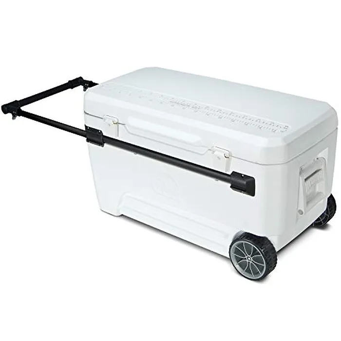 Horizontal telescoping handle requires 50percent less lifting effort . Ultratherm insulation in body and lid holds ice up to 5 days .Comfort-grip, locking telescoping handle .Oversized, soft-ride rally wheels for easy transport and a smooth ride .Virtually indestructible stainless steel hinges . Impact-resistant DuraLatch lid closures . UV inhibitors and infrared technology protect the cooler against sun damage . Threaded drain plug for optional hose hook up for easy draining . Fish ruler molded into lid lets you measure your catch instantly.