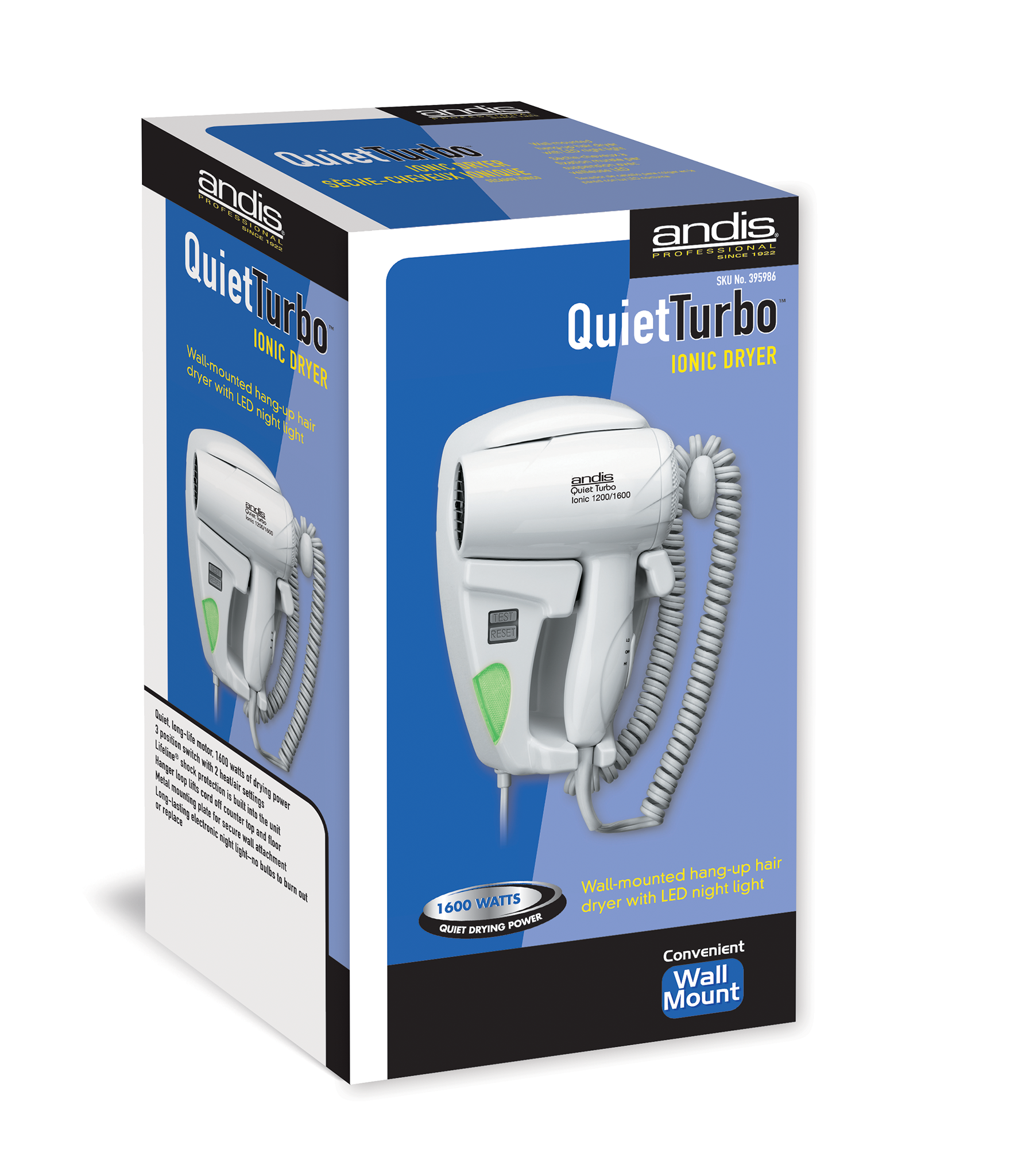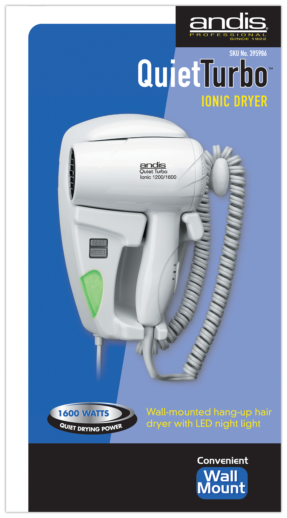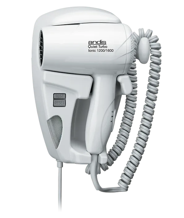 Andis 30975 Quiet hangup 1600 Watt hair dryer with night light, is a wall-mounted hang-up hair dryer with LED light. It has a quiet, long-life motor, and Lifeline shock protection that is built into the unit. It has a 3 position switch with 2 heat and air settings. The metal mounting plate is for secure wall attachment. It features a new hanger loop. An exclusive Andis innovation in cord storage. It has a long-lasting electronic light, no more bulbs to burn out or replace. Its soft, diffused light provides visibility for safely moving around. It is less expensive to operate than most night lights. It stays cool and is energy efficient.
