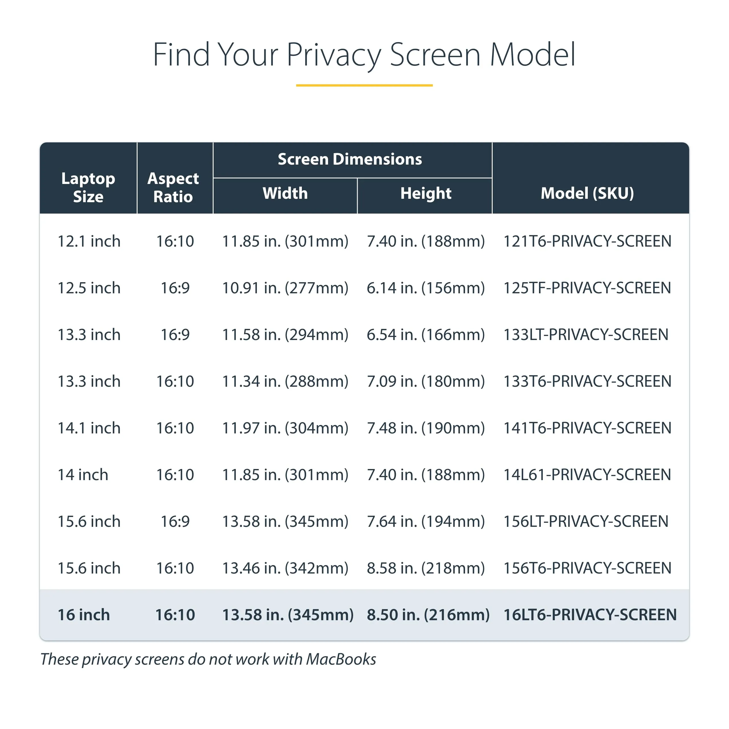 Startech 16LT6-PRIVACY-SCREEN 16inch 16:10 Touch Privacy Screen Antiglare Blue Light Filter Laptop Monitor
