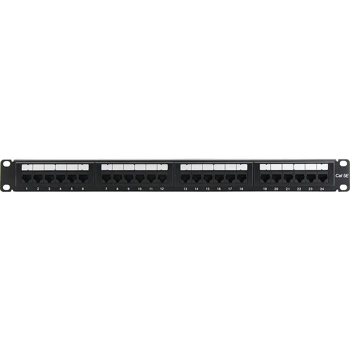 This 1U 24-port Cat5e patch panel is designed for efficient and organized network cabling. It features a 568B punchdown configuration and is suitable for rackmount installation in standard server racks or cabinets.