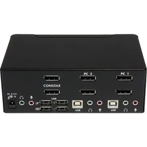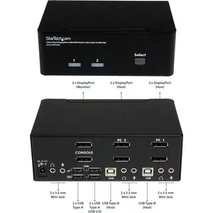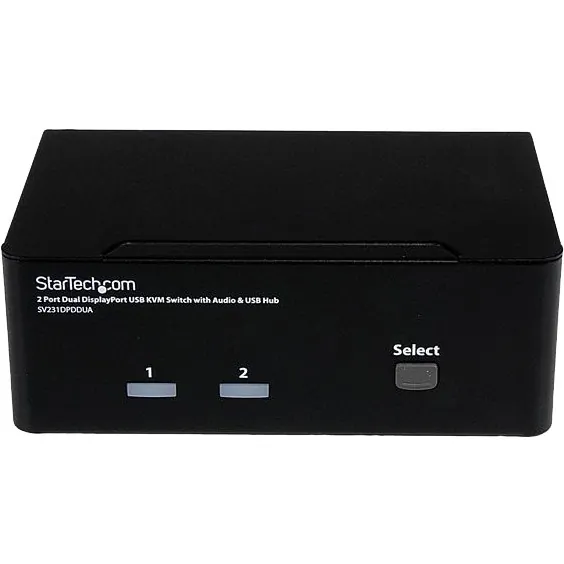 General InformationThe SV231DPDDUA 2-Port USB Dual DisplayPort KVM Switch with Audio and USB 2.0 Hub combines next generation digital display standards with seamless KVM control, allowing you to switch between 2 dual head or twin DisplayPort systems. Also ideal for systems with a single DisplayPort output, and a second video source such as DVI or HDMI, using a low cost accessory adapter. Delivering multi-computer control for high-res multimedia applications, the dual view KVM supports resolutions of 2560x1600 (@60 Hz) with DisplayPort HD audio, as well as 2-channel analog stereo audio and microphone input. Suitable for high quality static imaging, such as medical applications (MRI, X-ray, etc.), a maximum resolution of 3840x2400 is supported at reduced refresh rates. This product is TAA compliant and backed by a Startech.com 3-year warranty with free lifetime technical support. Technical InformationNumber of Computers Supported: 2Number of Local Users Supported: 1Daisy Chain Supported: NoVideoGraphic Mode: WQUXGAMaximum Video Resolution: 3840 x 2400Interfaces/PortsUSB: YesDisplayPort: YesNumber of USB Ports: 6Number of DisplayPorts: 6Power DescriptionInput Voltage: 120 V ACInput Voltage: 230 V ACInput Voltage Range: 110 V AC - 240 V ACPower Consumption: 18 WPhysical CharacteristicsColor: BlackMaterial: SteelForm Factor: DesktopHeight: 2.3"Width: 6.3"Depth: 3.9"Weight (Approximate): 1.62 lbMiscellaneousPackage Contents: 2-port Dual Display DisplayPort KVM 1 x Universal Power Adapter (NA/EU/UK/AU) 1 x Instruction Manual Environmentally Friendly: YesEnvironmental Certification: REACHEnvironmental Certification: WEEEEnvironmental Certification: RoHSTAA Compliant: YesWarrantyLimited Warranty: 3 Year