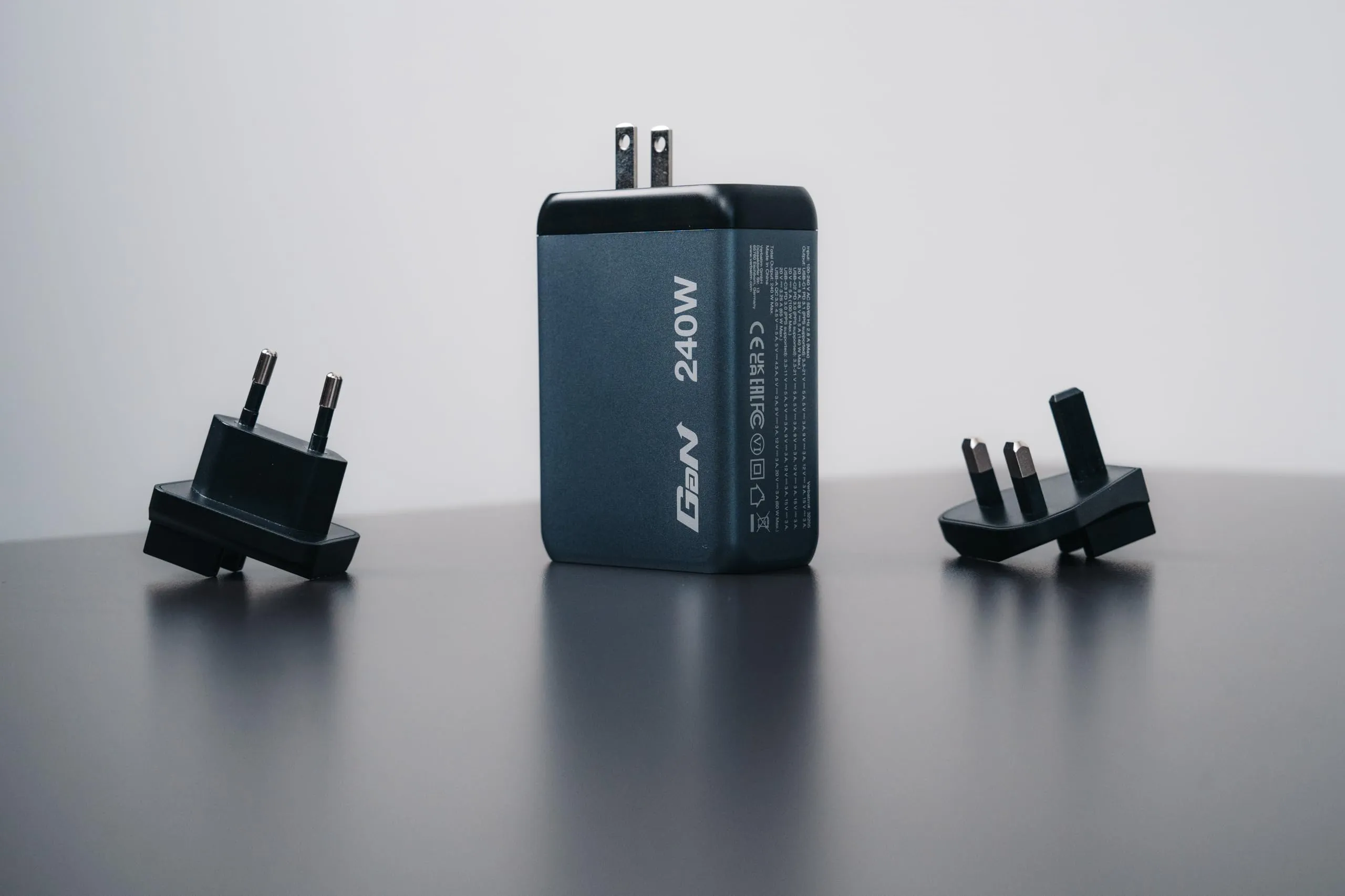 The 240W GaN Wall Charger offers an efficient charging solution with three USB-C PD ports and one USB-A QC 3.0 port, all in a compact design. Perfect for home, office, or travel, this charger powers up various devices including tablets, smartphones, and gaming gadgets. Equipped with foldable prongs and interchangeable EU and UK plugs, it’s your ideal travel partner. Thanks to Gallium Nitride (GaN) technology, this charger provides fast, powerful charging while being lightweight and heat-efficient. Constructed from high-quality, flame-resistant materials, it features multiple safety protections for a secure charging experience.