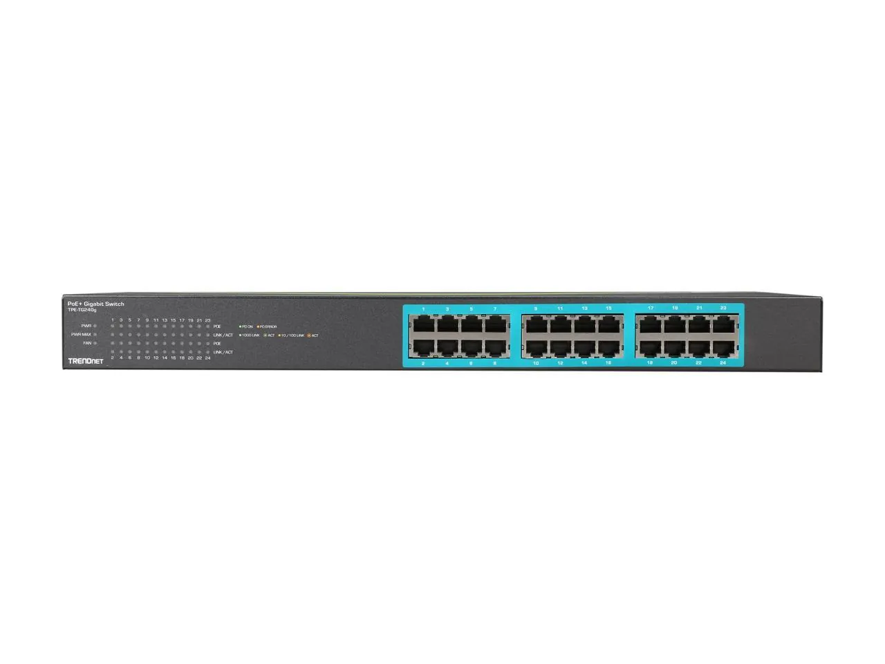 TRENDnet's 24-Port Gigabit PoE+ Switch, model TPE-TG240g, offers 24 x Gigabit PoE+ ports, a 48 Gbps switching capacity, and a PoE power budget of 370 Watts. This rugged metal switch comes with a rack mount kit.
