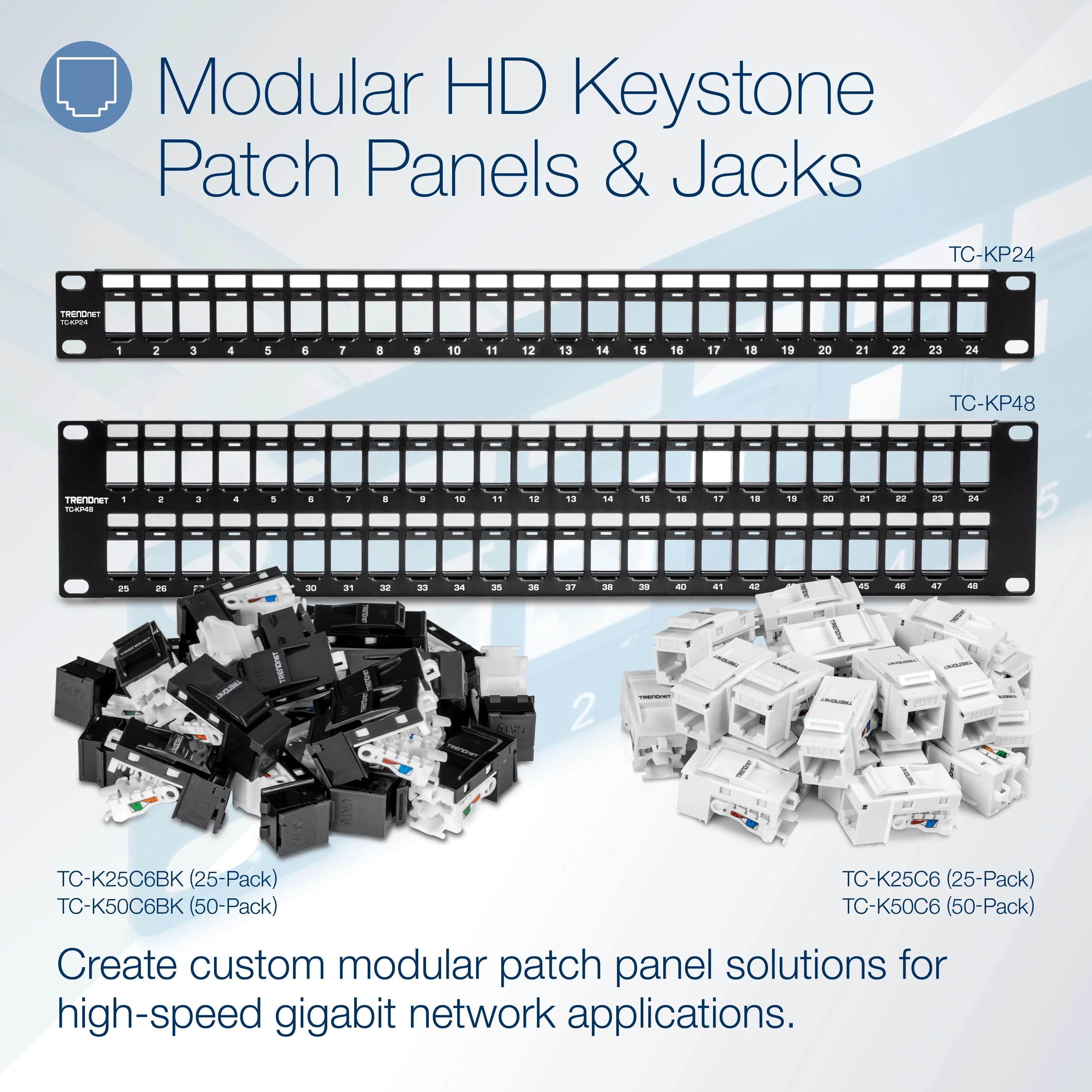 The TRENDnet 25-Pack Modular Inserts in Black are designed for durability and efficiency. Ideal for various networking setups, these modular inserts provide reliable connectivity solutions. Each pack includes 25 inserts, making it a perfect choice for expandability and organization.
