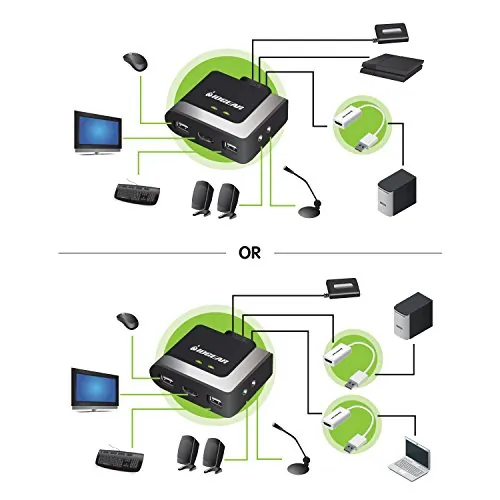 IOGEAR's HDMI and DisplayPort KVM Solution enables effortless control over two computers using a single USB keyboard, a USB mouse and a monitor with HDMI connection or HDTV. This bundle is perfect for a home office or small / medium size business, as it offers the flexibility of choosing between HDMI and/or DisplayPort connections. Take advantage of your existing computers, and use the included DisplayPort adapters to display your content on a large HDMI display or HDMI projector.