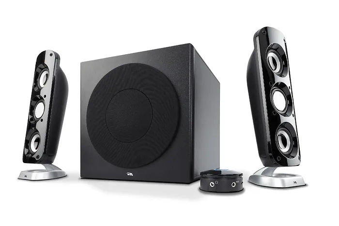 3 piece Powered Speakers. PC Speakers, control pod, aux-in, bass. Dual Satellite drivers with passive radiators