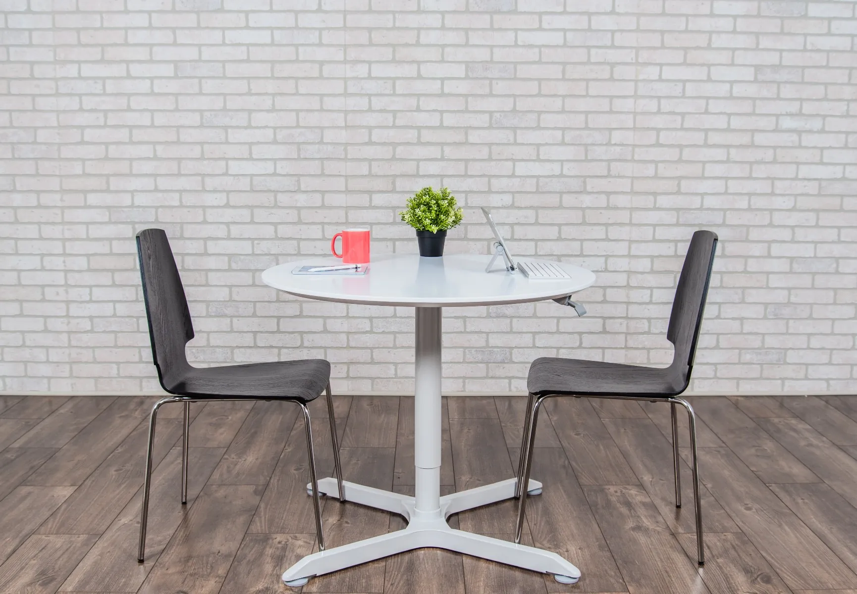Luxor’s pneumatic height adjustable café tables feature durable construction, a contemporary, easy-to-clean white finish, and contoured edges, making them ideal for business, retail, or educational environments. These multi-purpose round tables smoothly adjust in height with the aid of a pneumatic air cylinder, allowing them to be used in both seated and standing positions.