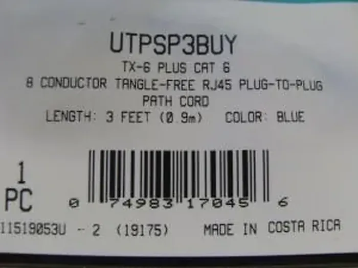 The Panduit TX6 PLUS is a high-performance patch cable designed for reliable connectivity in networking applications. This 3-foot cable features RJ-45 male connectors on both ends, ensuring secure and efficient data transmission.