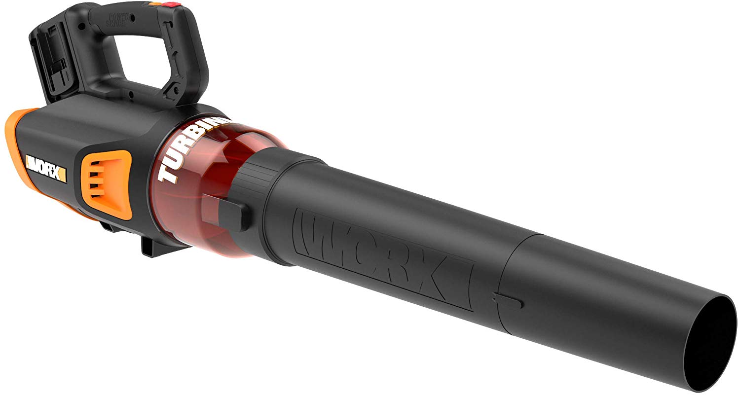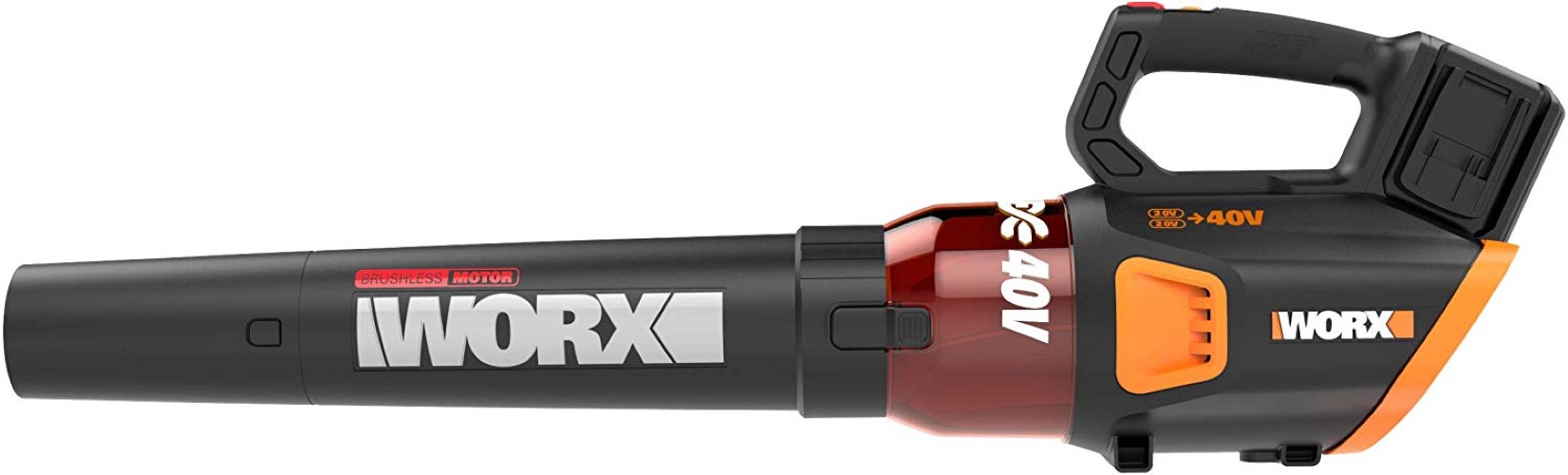 The WORX WG584 430cfm 40V(2x20VLi-ion) Blower. Electric blower Powerful 40V Max Lithium lightweight cordless blower with TURBINE technology and a brushless motor delivers up to 430 cfm of air velocity. The three-speed control function allows for light-to-medium duty cleaning while the TURBO option blasts leaves from any type of surface. FEATURES:Dual 20V Power Module batteries delivers 40V Power and Performance. Highly efficient brushless motor design for long lasting power; Three-speed control with TURBO boost; Air volume speed/volume: 1: 60mph / 300cfm, II:69mph / 350cfm, III: 80mph / 390cfm ; Turbo: 95mph / 430cfm; 430 CFM Powerful blowing force to tackle any job; On-board battery charge level indicator; Lightweight and ergonomic one-hand operation; Charging time: 2.5 Ah (1pc): 75 min, 2.5 Ah (2pcs): 150 min.