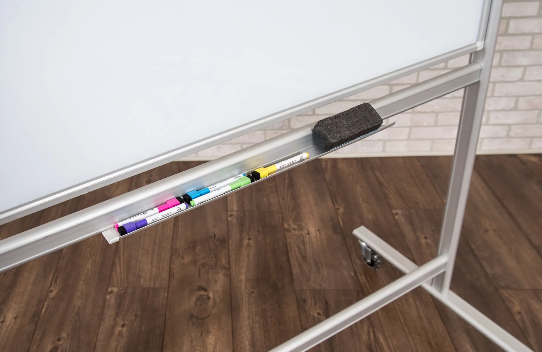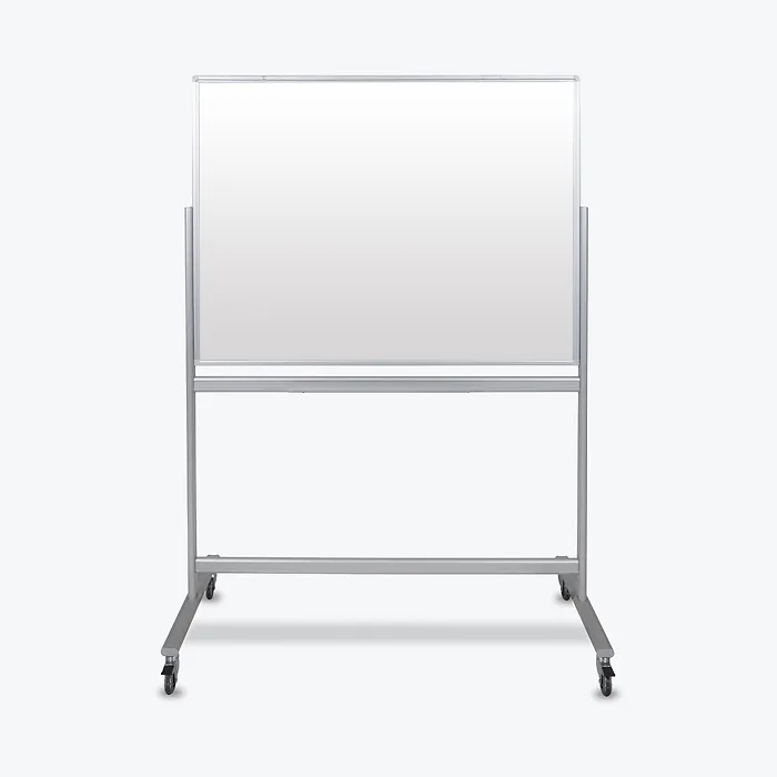 The Luxor mobile magnetic glass whiteboard offers double the writing space and is designed for easy movement, making it an ideal choice for collaborative work environments. Featuring a durable aluminum frame and a wide base for stability, this modern board boasts a super-clear glass surface that provides an optimal writing experience with wet and dry erase markers.