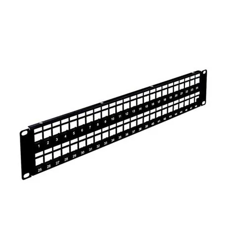 This 48-port blank keystone patch panel is designed for efficient cable management in network environments. It fits perfectly in a 2U space within standard 19" racks. Constructed with durable materials, it includes copper ground wire and features a removable lacing bar for better organization.