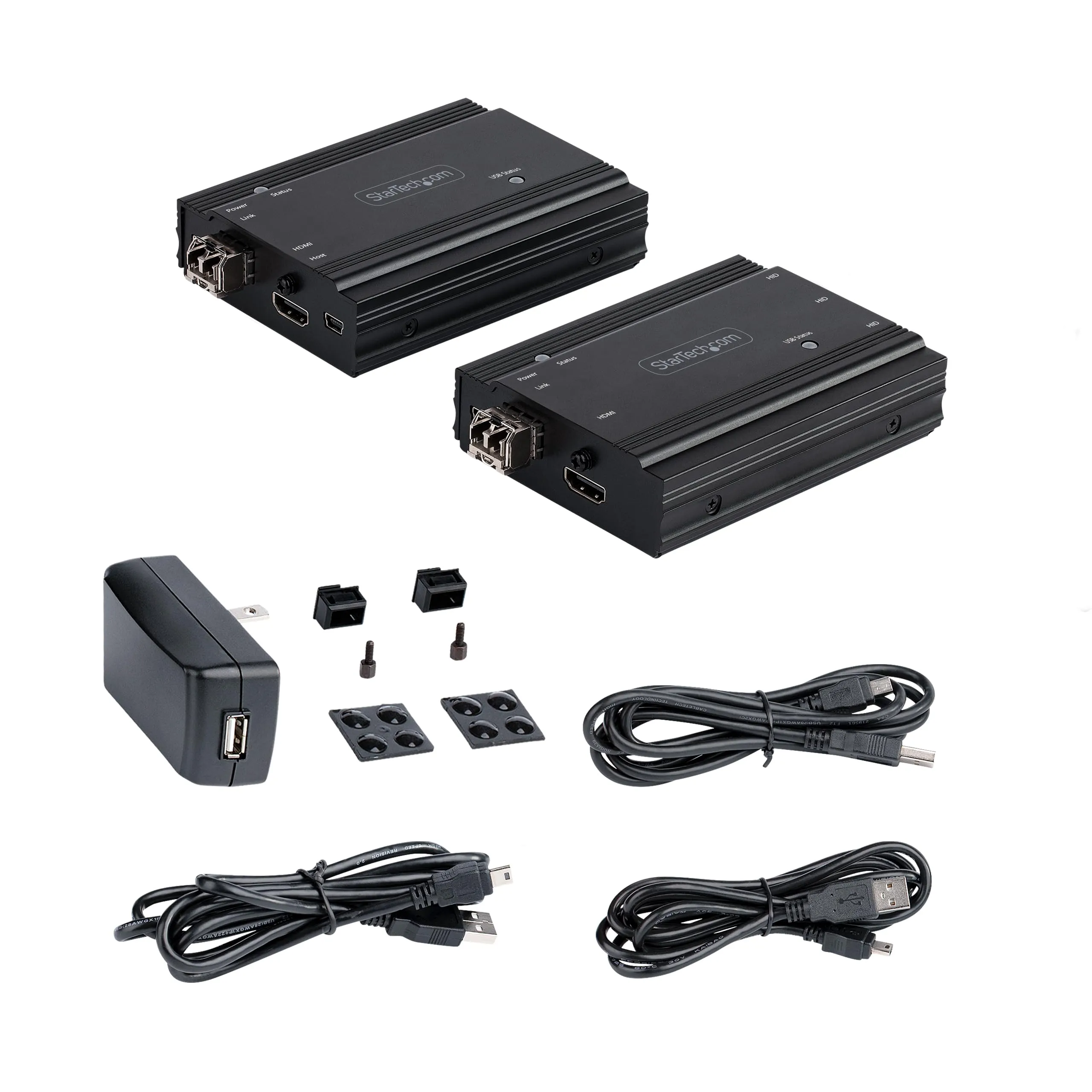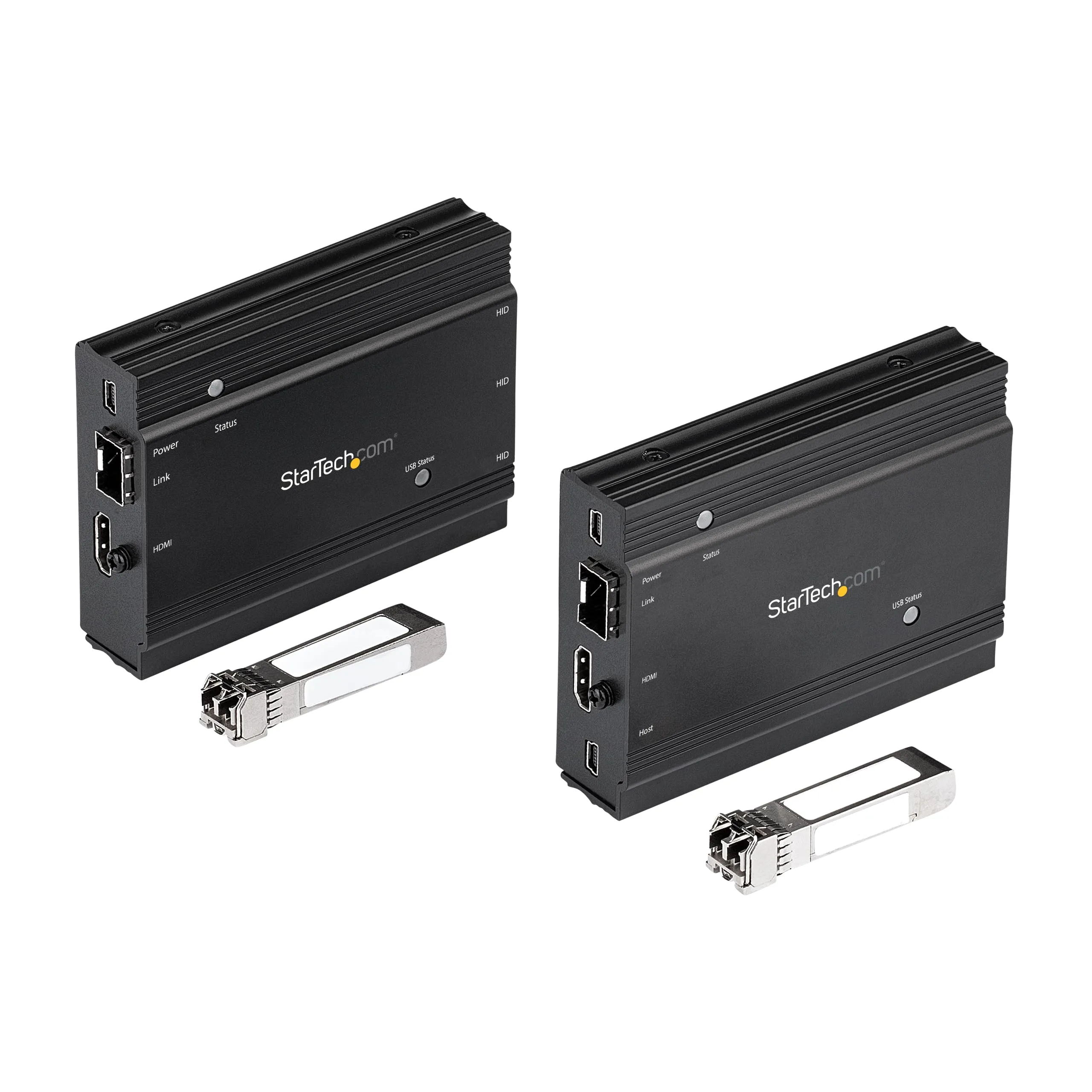 Startech SV565FXHD4KU - USB and 4K HDMI KVM extender over fiber controls a KVM switch/console or PC using fiber optic cable up to 984' (multimode) or 1640' (single mode) - 4K 60Hz UHD video (up to 3840 x 2160 60Hz)/4:4:4 sampling - Open SFP+ slots allows for MSA compliant 10G SFP+ modules - 3x USB 2.0 HID OS Independent EDID Passthrough HDCP 2.2 Digital 7.1 Audio Supports MM/SM SFP+ Incl. 2x 10G MM SFP+ LC Connectors Transmitter + Receiver Kit - No proprietary software/network settings to configure.