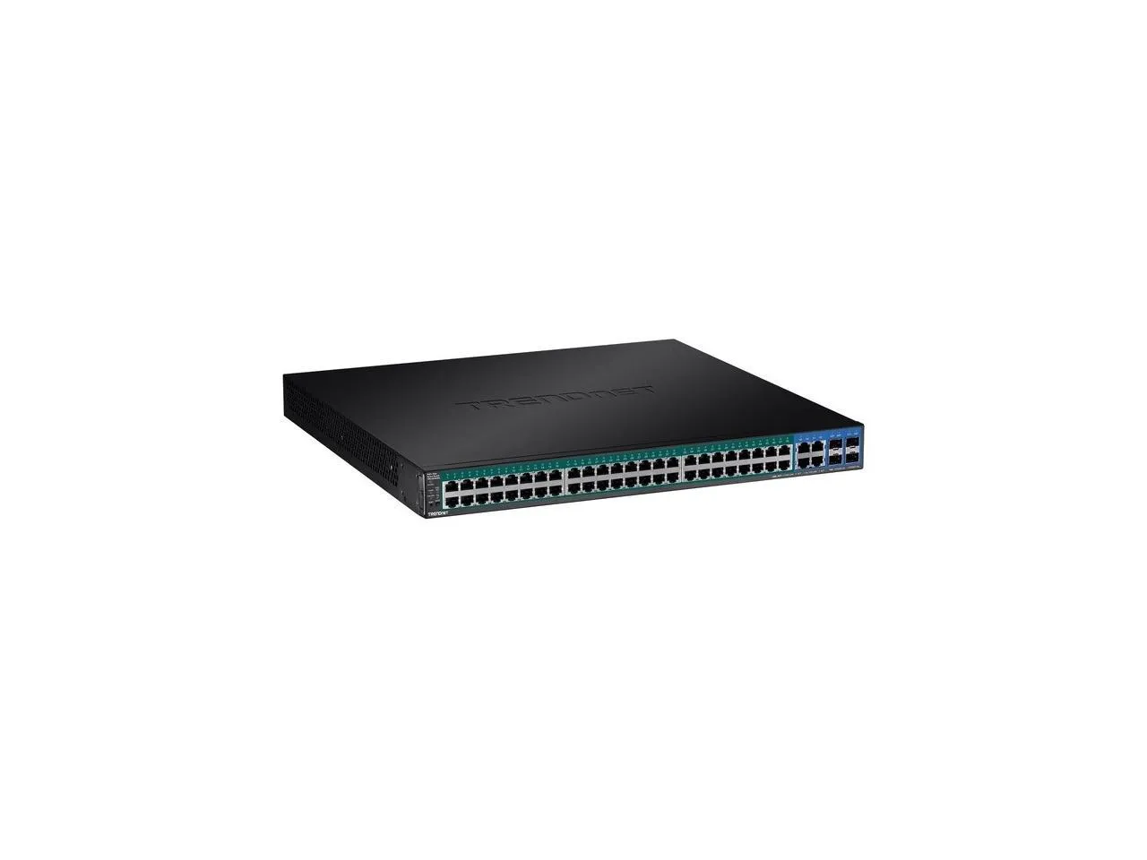 TRENDnet 52-Port Gigabit Web Smart PoE+ Switch, 48 Gigabit PoE+ Ports, 4 Shared Gigabit Ports (RJ-45 Or SFP), 370W PoE Power Budget, 104Gbps Switching Capacity, Lifetime Protection, Black, TPE-5240WS