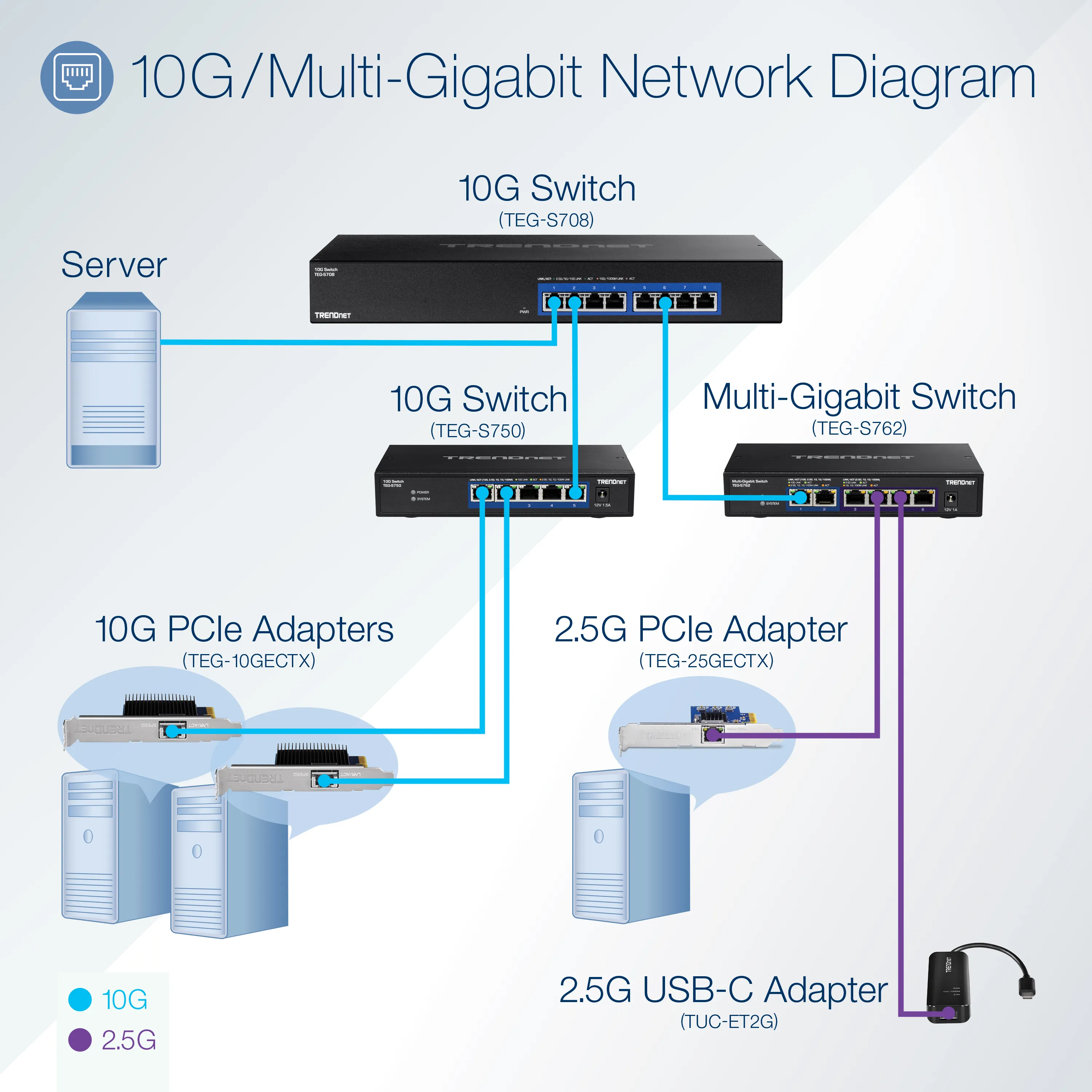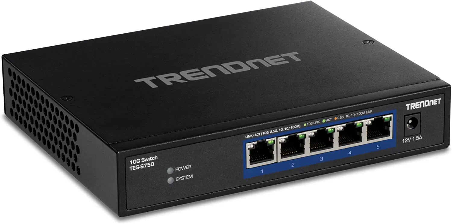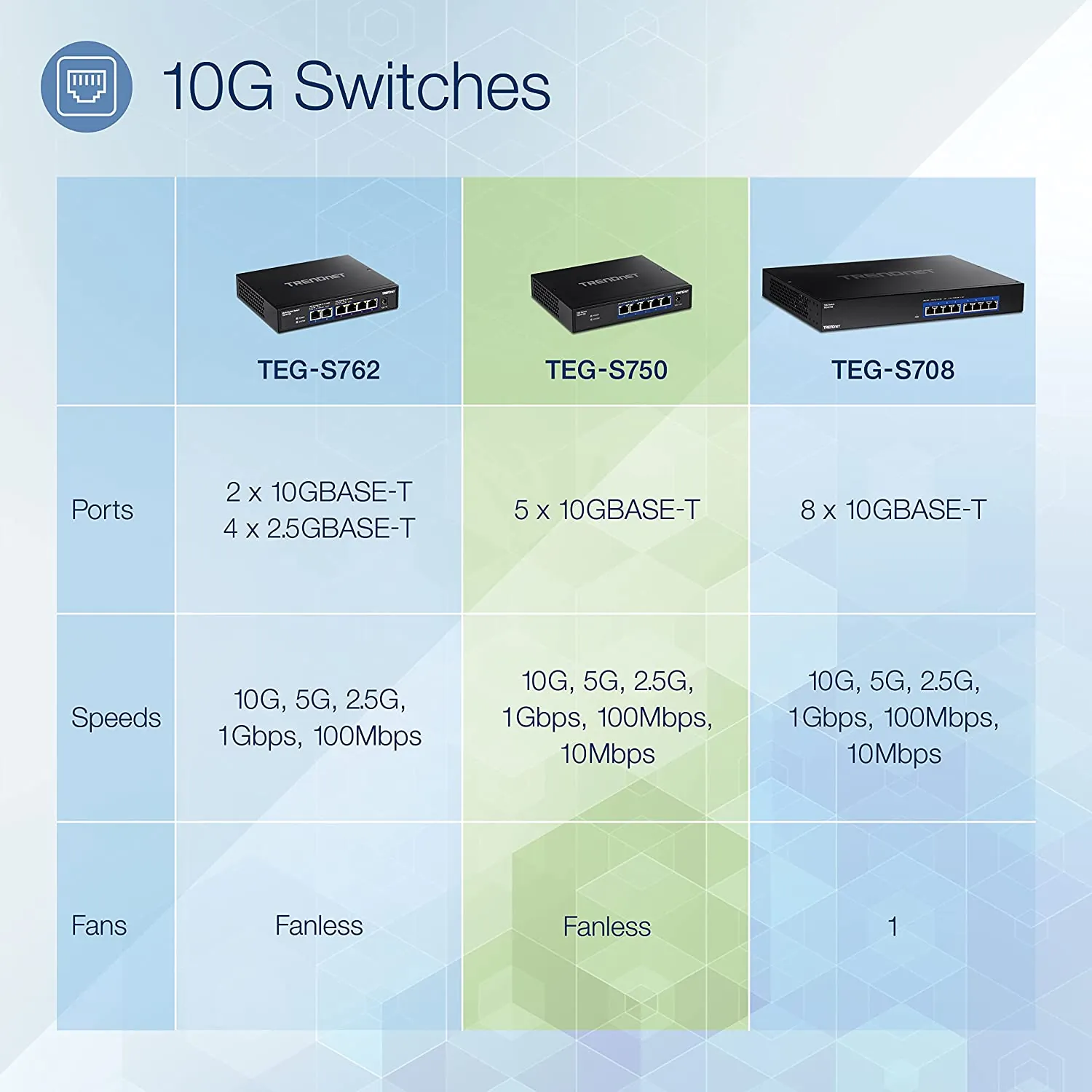 TRENDnet's 5-Port 10G Ethernet Switch, model TEG-S750, offers exceptional high bandwidth performance along with reliability and ease of use. This switch features five dedicated 10G Ethernet ports, ensuring high-speed network connections with an impressive 100Gbps switching capacity.