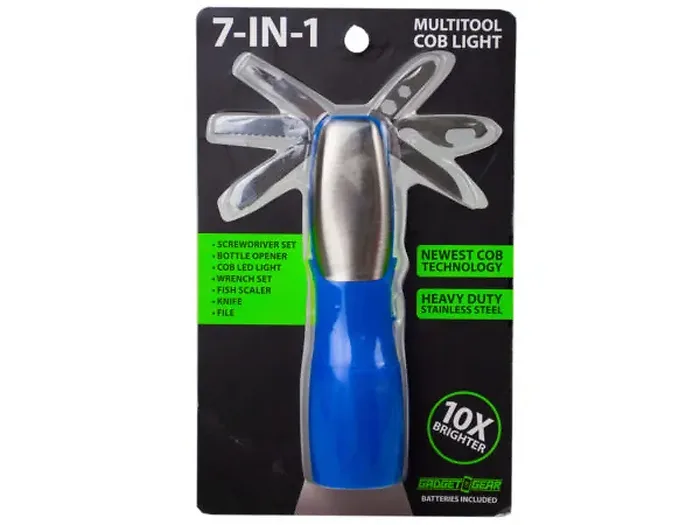 This versatile 7-in-1 COB LED Multitool by Gadget Gear is equipped with everything you need for a variety of tasks. It includes a screwdriver set, bottle opener, COB LED light, wrench set, fish scaler, knife, and filer. Crafted from heavy-duty stainless steel, this multitool is built to last. The COB light is ten times brighter than standard lights, making it ideal for any situation. Batteries are included, ensuring you can use it right out of the package. The tool is neatly packaged in a 7-inch by 4.35-inch hanging blister pack.