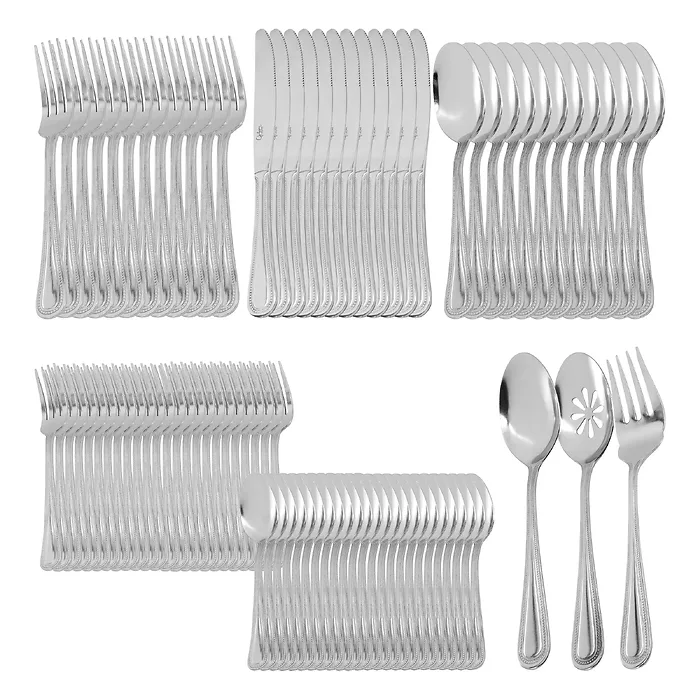 This comprehensive set includes: 12 dinner forks, 12 dinner spoons, 12 dinner knives, 24 salad forks, 24 teaspoons, 1 slotted serving spoon, 1 solid serving spoon, and 1 serving fork, providing everything you need for all dining occasions.