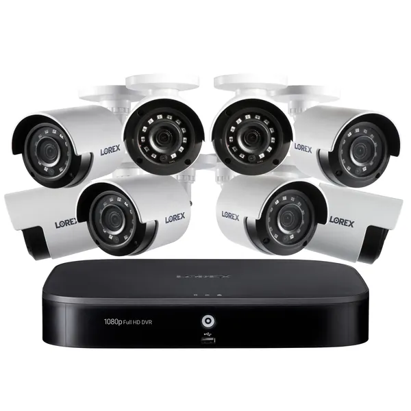 • 1920 x 1080p Full HD resolution for crisp, detailed footage;• Hardwired DVR and multi-camera system for constant connectivity; each camera connected to DVR via siamese BNC cable for both power and video;• Night vision out to 130 ft. in ambient lighting; 90 ft. in total darkness; infrared cut filter auto switches between day and night for accurate color reproduction;• DVR with security-grade hard drive expandable to 8 TB;• Compatible with Lorex(R) Smart Home security center; also compatible with Alexa(R) and Google Assistant(TM) for voice commands and Chromecast(TM) or Amazon Fire(R) TV Stick for viewing on larger screen;• Person and vehicle smart detection reduces false alarms caused by moving branches or animals; feature available across all DVR channels;• Weatherproof (IP66), all-season cameras work in -22deg F to 140deg F temperatures;• Polycarbonate housing and cable pass-through design keeps cabling concealed to help prevent vandalism;• Includes mounting kits, 60 ft. extension cables and power adapters for cameras, HDMI(R) cable, mouse, Ethernet cable, and power adapter for DVR ;• 8 cameras;