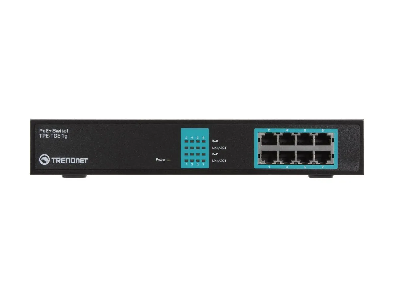 TRENDnet's 8-Port Gigabit GREENnet PoE+ Switch, model TPE-TG81g, reduces equipment and installation costs by delivering data and power over existing Ethernet cables. This unmanaged switch offers eight Gigabit PoE+ ports which supply up to 30 watts of power per port for devices such as high power wireless access points, PTZ (Pan / Tilt / Zoom) internet cameras, and VoIP telephony systems.