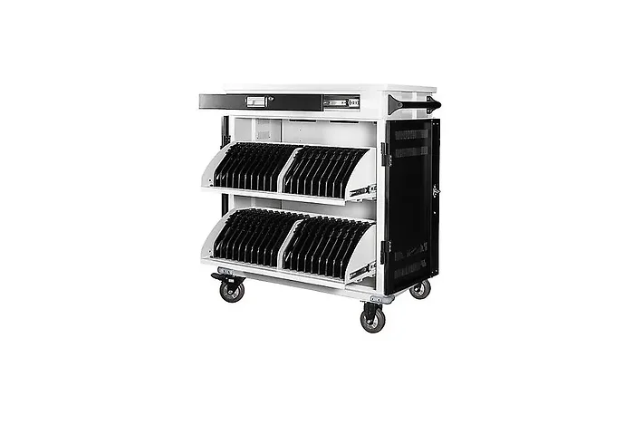 The AC-PRO-II 40 Bay Charging Cart is designed to efficiently charge and store up to 40 devices, accommodating devices with screens up to 15 inches. Its robust construction and user-friendly design make it an ideal solution for schools, offices, and other environments requiring multi-device management.