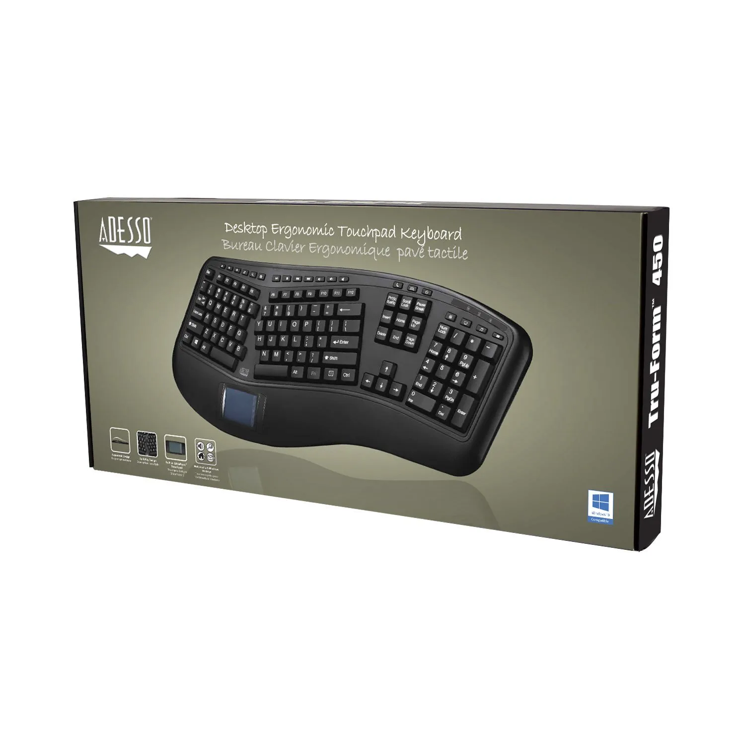 Adesso ADE AKB450UB Truform Ergonomic Touchpad Keyboard Cable Connectivity Usb Interface 104 Key Playpause Previous Track Next Track Volume Down Volume Up Mute Eject Home Back Forward Refresh ... Hot Keys English Us Qwerty Layout Computer Touchpad Windows Membrane Keyswitch Black