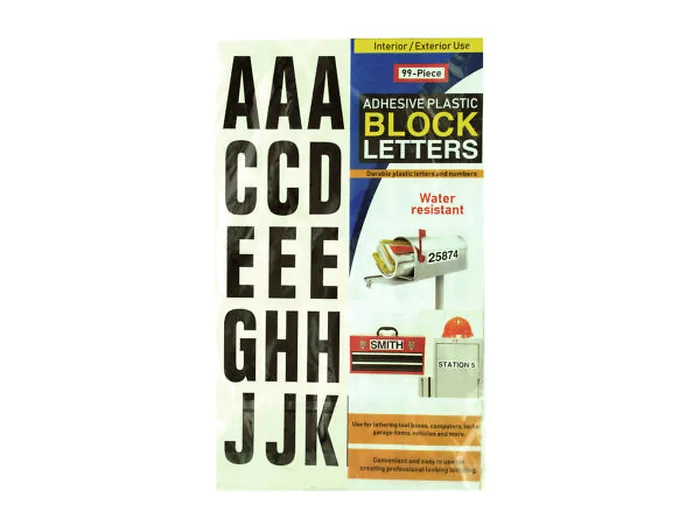 Ideal for indoor and outdoor use, this 99-piece 2" Adhesive Plastic Block Letters Set features durable plastic letters and numbers that are convenient and easy to use for creating professional looking lettering. Can be used on water resistant and non-water resistant surfaces. Use for lettering tool boxes, computers, lockers, garage items, and even for cars and other vehicles. Each letter measures approximately 2.25" x 1". Comes packaged in a hanging poly bag.