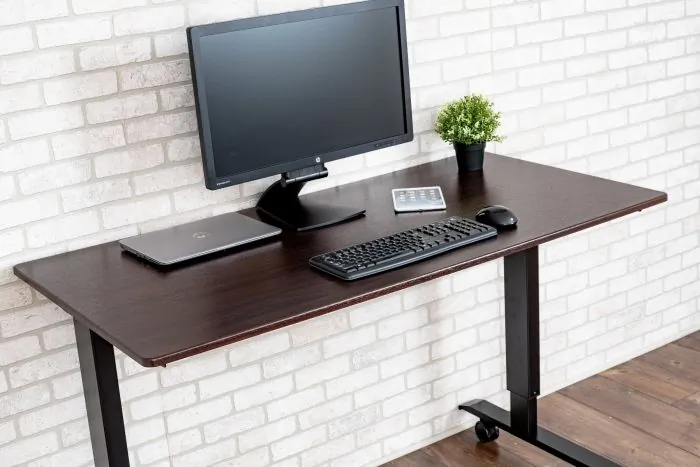 Boasting a spacious 59” x 29.5” work surface, it comfortably accommodates multiple monitors along with a full-sized keyboard and mouse. The height range supports both taller and shorter users, making it versatile for any workspace. Included are leveling glides and casters, two of which have locking brakes, ensuring easy maneuverability.