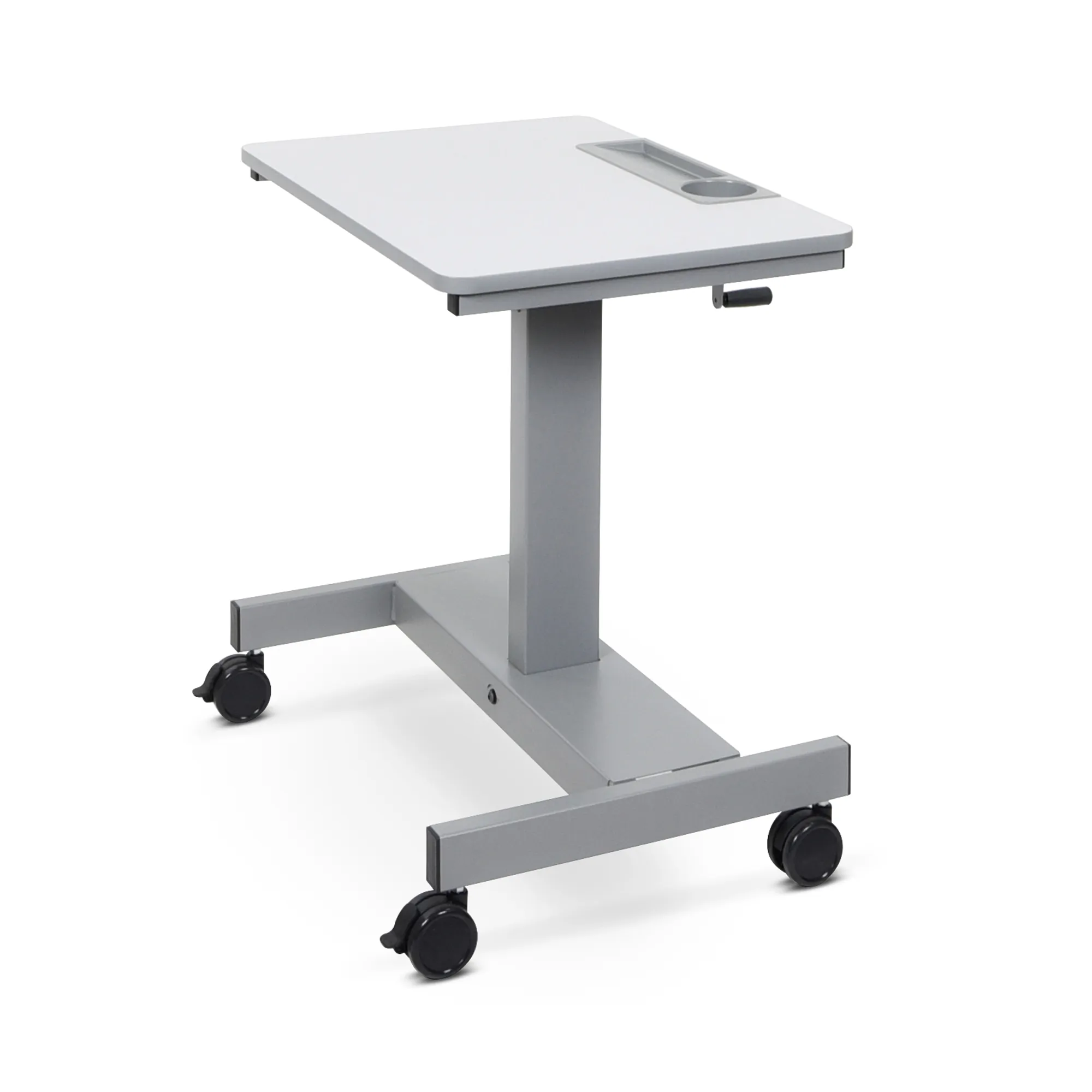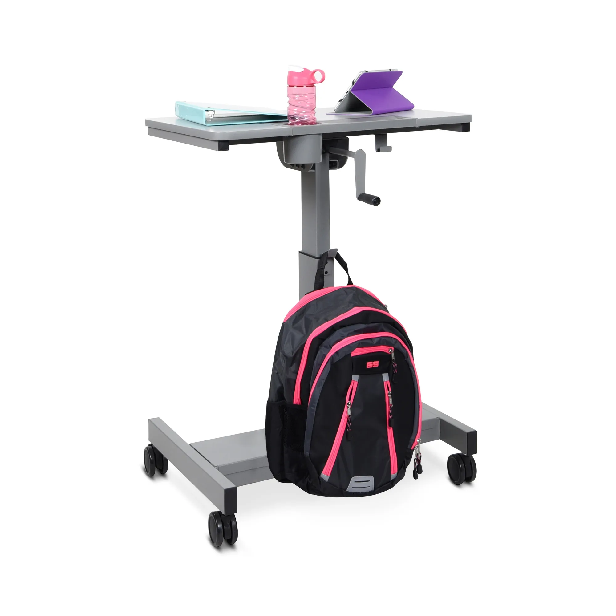 This desk features a height adjustment mechanism, allowing tabletops to be raised or lowered from 29" to 42" high using a crank handle. It includes dedicated space for pencils and a water bottle, promoting organization and convenience. With four casters, the desk is mobile, encouraging collaboration among students and offering flexible classroom layout options.