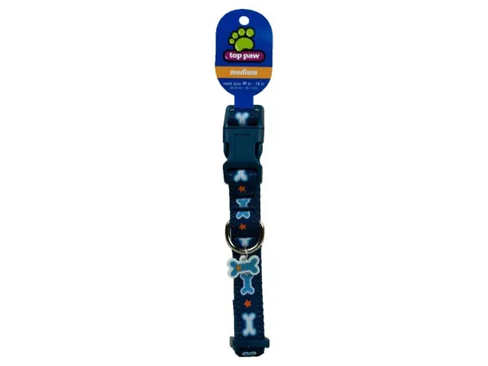 The design showcases a charming blue and white bone pattern accented with vibrant orange stars, making your pet stand out on walks. This collar fits neck sizes from 14" to 18", catering to a variety of medium-sized dog breeds.