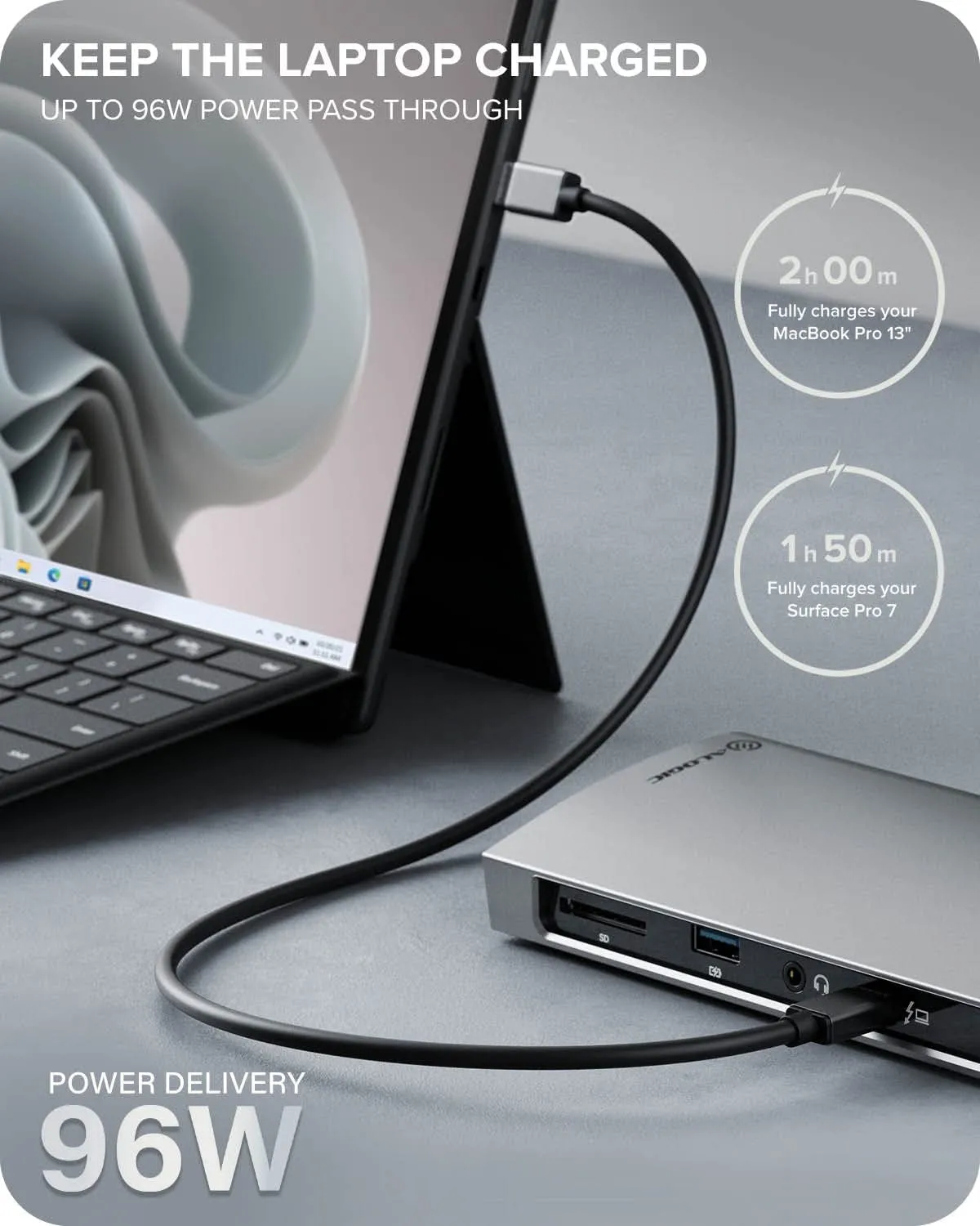 - Power delivery up to 100W for charging laptops