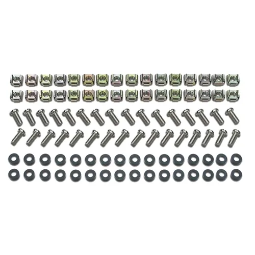 M6 hardware for mounting equipment in enclosure with square hole mounting rails. Qty. 32 sets of M6 cage nuts, nylon washers and slot/phillips screws.