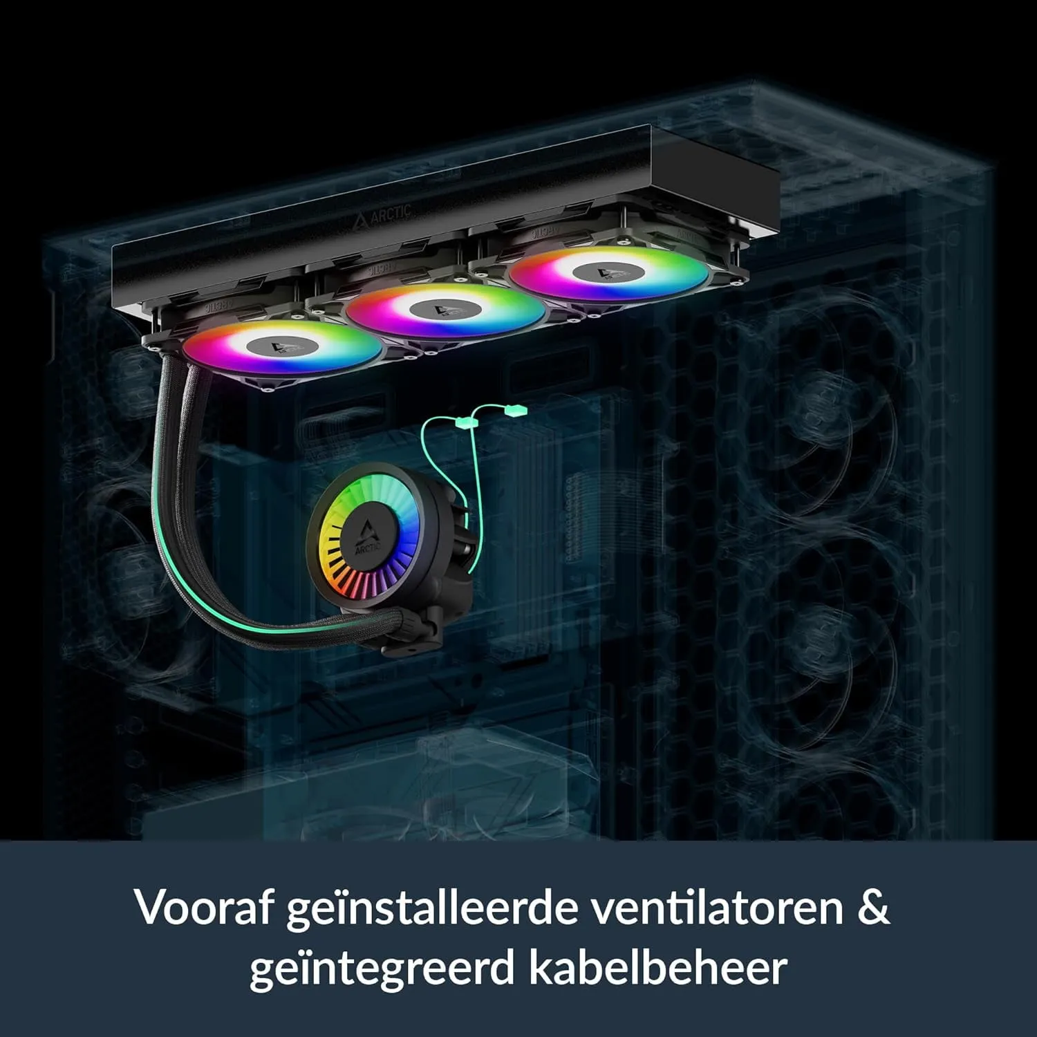 The ARCTIC Liquid Freezer III Pro 360 A-RGB is an advanced all-in-one CPU water cooler designed for efficient thermal management and stunning aesthetics. Featuring customizable addressable RGB lighting, this cooler integrates seamlessly with both Intel and AMD platforms, including Intel LGA1851, LGA1700 and AMD AM5, AM4 sockets. Its high-performance pump and high-density radiator ensure optimal cooling performance, making it ideal for enthusiasts and gamers alike.