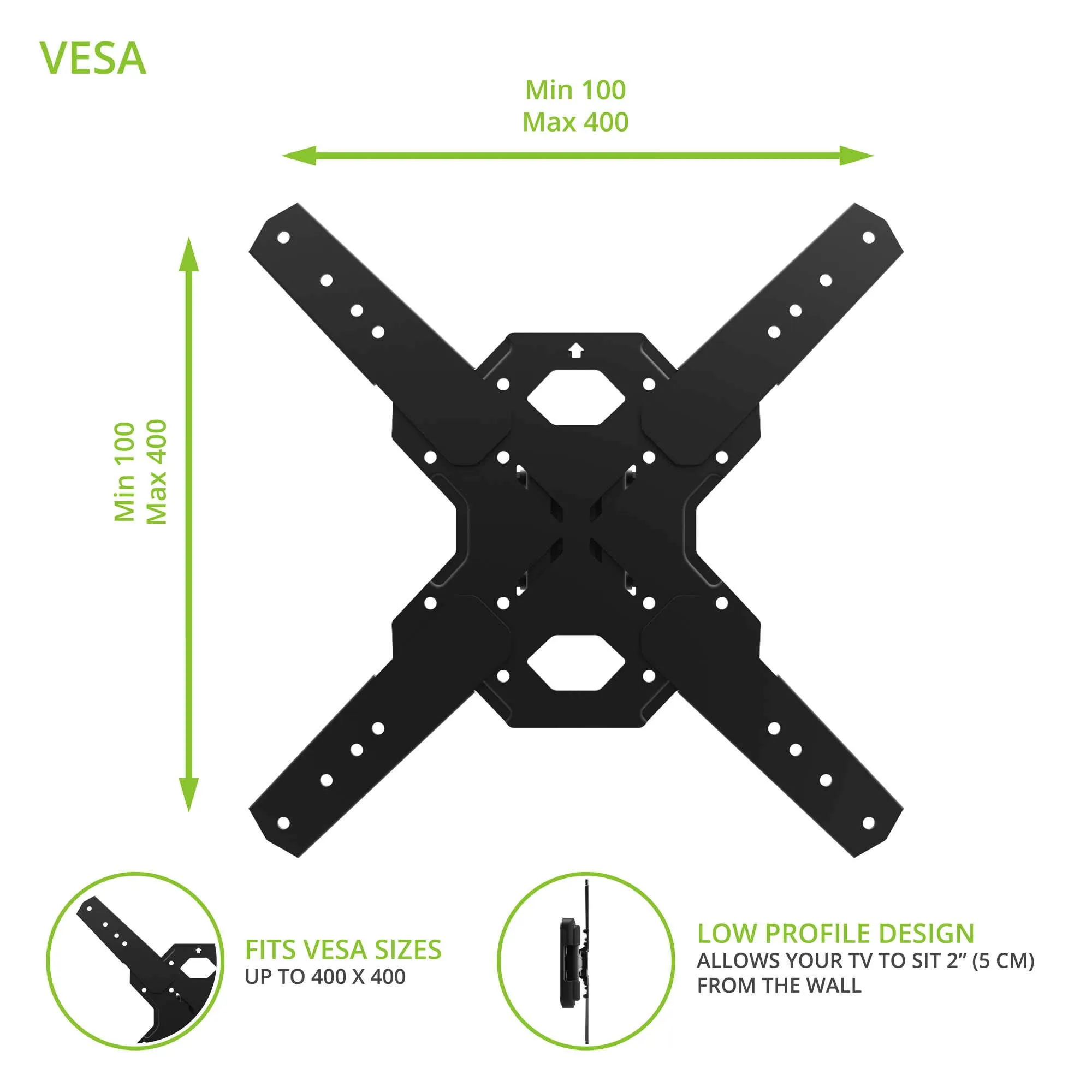- Accommodates various VESA sizes: 100x100 to 400x400