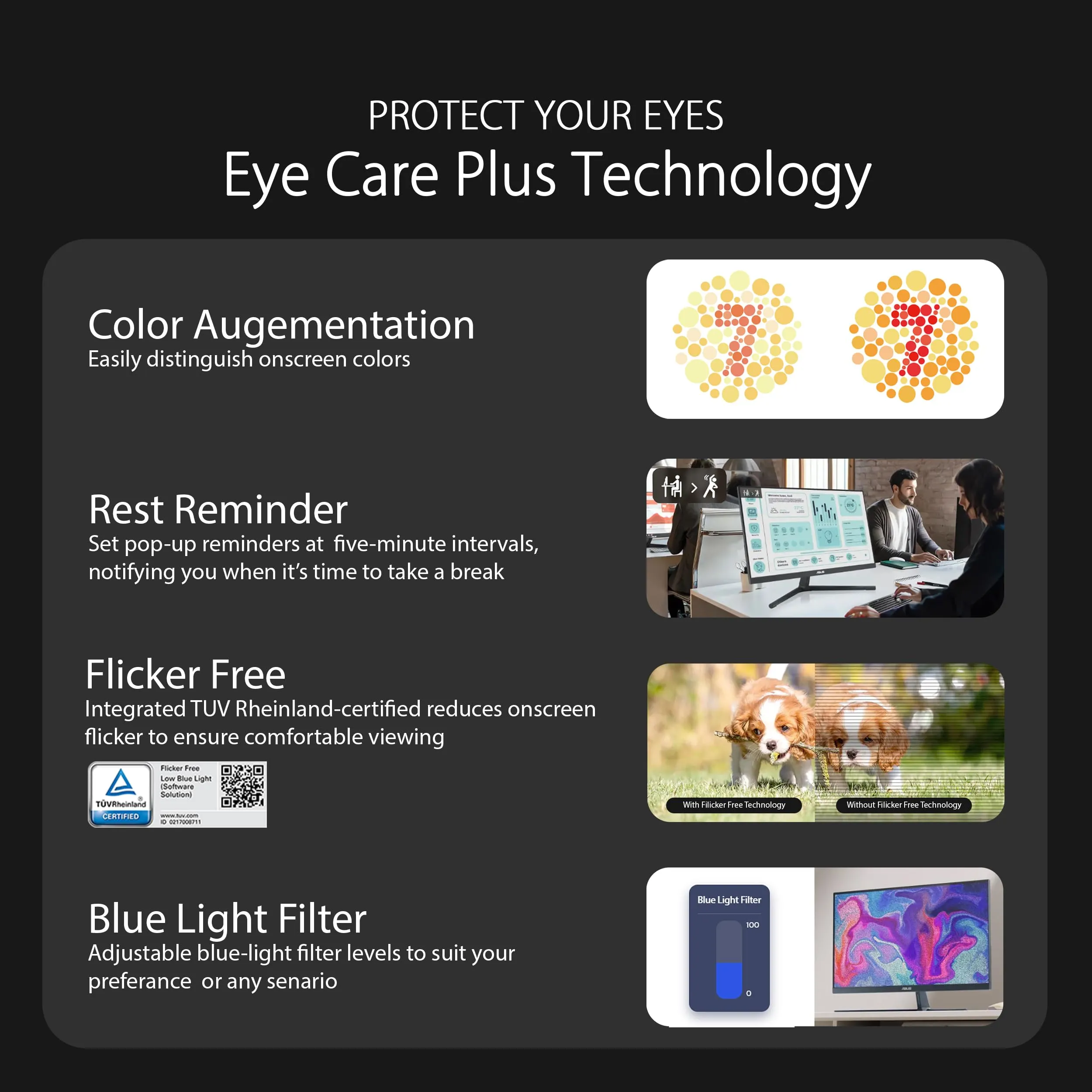 The ASUS 27-inch Full HD Eye Care Monitor combines stunning visuals with advanced EyeCare technology to provide an optimal viewing experience. Featuring a 1080P resolution and IPS panel, this monitor delivers vibrant colors and wide viewing angles, making it perfect for both work and entertainment.