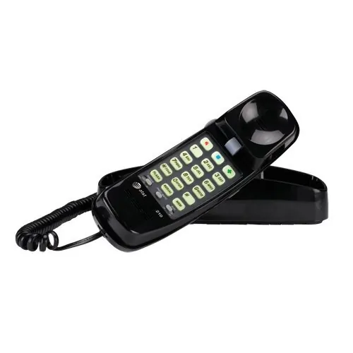 - The AT&T 210 Corded Trimline Phone with Speed Dial and Memory Buttons is a classic and functional option for a home or office telephone. The phone can be mounted to the wall or set on a flat surface in your kitchen, bedroom or office.- This black wall phone features a speed-dial memory that can hold up to 12 phone numbers, allowing you to call your friends and family with a touch of a button.- The AT&T 210 Corded Trimline Phone with Speed Dial and Memory Buttons also includes a handset volume control that lets you adjust the sound to a level that is comfortable for you. Three 1-touch memory buttons and a redial button provide additional functionality.