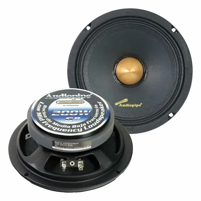 The Audiopipe 6-inch Low Mid Frequency Loudspeaker delivers exceptional audio performance, making it an ideal choice for your sound system. With a maximum power of 200W, it produces rich mid-range frequencies and enhances overall sound quality. Built with durability in mind, this loudspeaker features a gold bullet dust cap for improved longevity and performance.