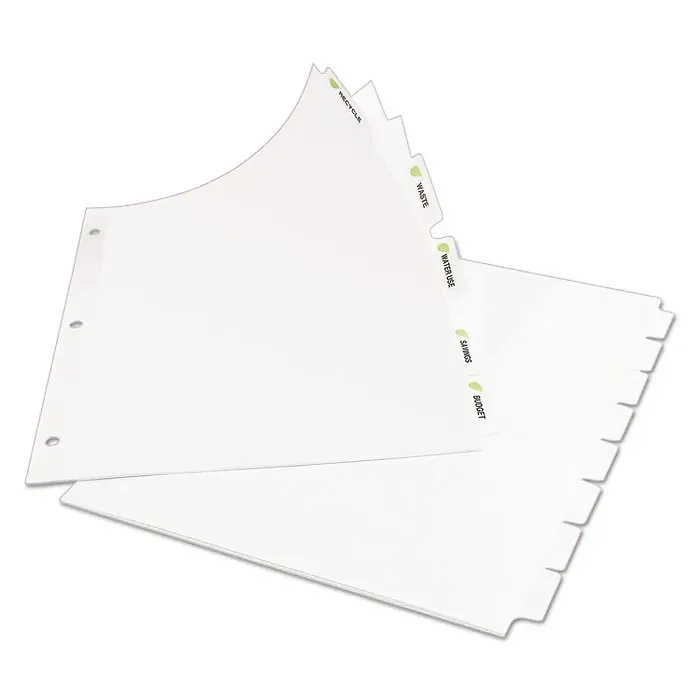 Eco-friendly index dividers are made with a high percentage of recycled paper. Print them from any laser or inkjet printer and then use the included Easy Apply label strips to perfectly align and apply all labels at once. Index dividers are great for large projects requiring more than one divider set. Each divider features a white tab and three-hole punched, reinforced binding edge. 8-1/2" x 11" size is designed for use with standard three-ring binders.
