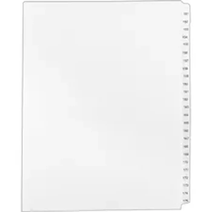 This Standard Collated Legal Divider Set features side tabs labeled 151 through 175 so it's perfect for index briefs, legal exhibits, mortgage documentation files and more. Clear, Rip Proof reinforced tabs are preprinted on both sides using Helvetica bold type for easy use. Unpunched binding edge on these letter-size dividers gives you the freedom to fit practically any binding system. Dividers are made of white paper stock.