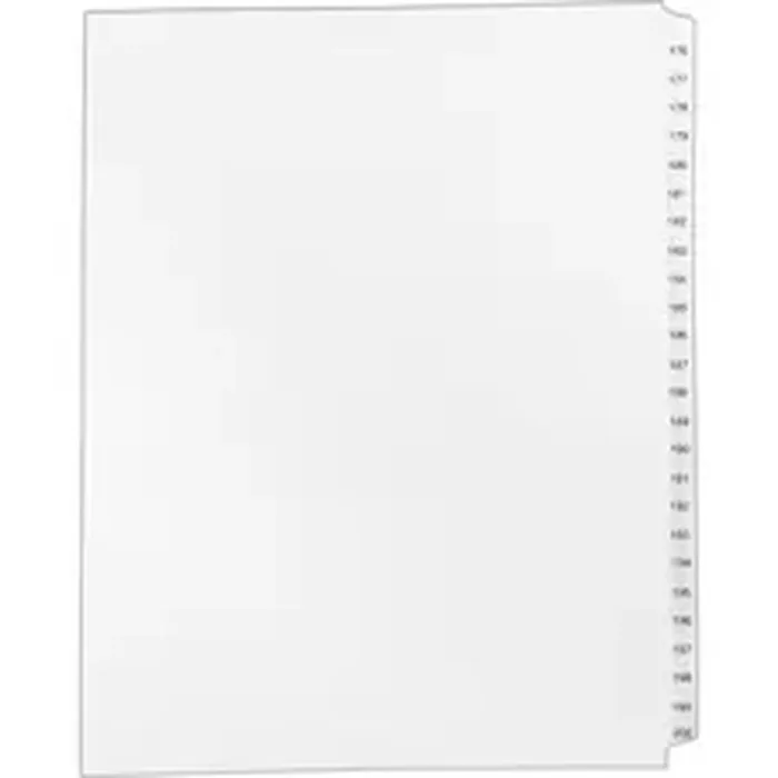 This Standard Collated Legal Divider Set features side tabs labeled 176 through 200 so it's perfect for index briefs, legal exhibits, mortgage documentation files and more. Clear, Rip Proof reinforced tabs are preprinted on both sides using Helvetica bold type for easy use. Unpunched binding edge on these letter-size dividers gives you the freedom to fit practically any binding system. Dividers are made of white paper stock.