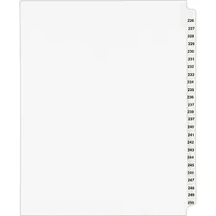 This Standard Collated Legal Divider Set features side tabs labeled 226 through 250 so it's perfect for index briefs, legal exhibits, mortgage documentation files and more. Clear, Rip Proof reinforced tabs are preprinted on both sides using Helvetica bold type for easy use. Unpunched binding edge on these letter-size dividers gives you the freedom to fit practically any binding system. Dividers are made of white paper stock.
