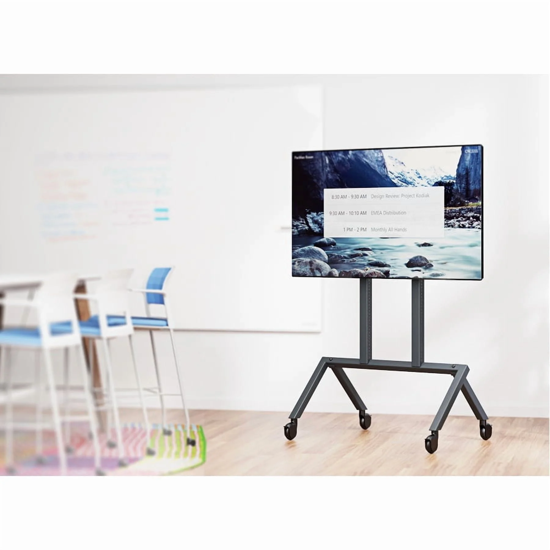 The Heckler AV Cart is designed specifically for the Google Meet Series One Board, perfectly accommodating the 65-inch size. This mobile solution offers a robust platform for seamless meetings and presentations, enabling users to move the equipment effortlessly between locations.