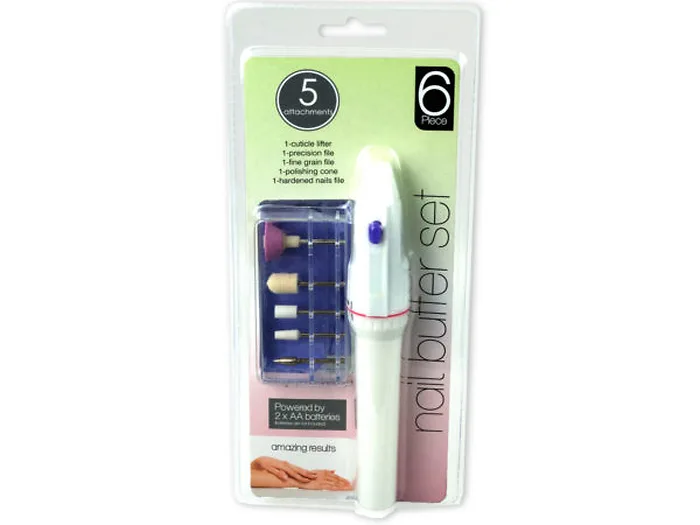 Get amazing results with this Battery Operated Nail Buffer Set - the perfect and convenient way to keep up with manicures at home! Buffer is easy to use, lightweight and portable. Ideal for both natural and artificial nails. Also includes 5 attachments for filing, shaping, sculpting and polishing. Easily store attachments inside the provided plastic case. Keep all items together in the included purple drawstring bag. Buffer uses 2 'AA' batteries (not included). Buffer measures approximately 6.5" long. Comes packaged in a blister pack.