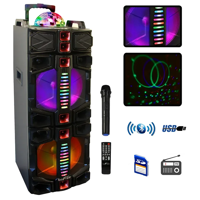 The new beFree Sound Rechargeable Bluetooth 12 Inch Double Subwoofer Portable Party Speaker with Dual Layer Reactive Party Lights, USB, SD, TF and AUX Inputs with FM Radio is an all in one entertainment assistant. This easily portable speaker includes hard mounted top handles for your convenience, and boasts a large frame to ensure its highly visible. With a Colorful Dual Layer Light Show Display, this sound system is sure to pump up the party. You can connect a variety of devices, and choose the input that is best to suit your needs. You always have the option of turning off the reactive light show for those more subtle gatherings and allowing yourself to enjoy the strong, clear sound provided by the Dual 12 Inch Subwoofers. EASILY CONNECTABLE: beFree has your convenience in mind. Bluetooth may be your favorite connection, and we understand, but there are times when other options are needed. With you in mind, beFree Sound has jam-packed this ultimate party speaker with connections to ensure you have every option you need. This Speaker offers USB, SD, TG and AUX Inputs. It also features a Microphone Jack for your wired microphone, or you can connect the included wireless microphone and feel free to move around while you dance and sing to your favorite karaoke tunes. DUAL LAYER REACTIVE PARTY LIGHTS: The Party never stops while this speakers light show is wowing your guests. There are two layers of individually reactive lights which change according to volume setting. While you may have had other party lights in the past, this speaker is sure to amaze and entertain with it’s unique style and brilliant lights. EASILY PORTABLE: Hard mounted top handles, and Dual Rolling Wheels make this unit easy to transport and handle. Designed with your convenience in mind so that you’ll never have to leave this speaker behind. STRONG CLEAR SOUND: This speaker won’t impress you with it’s size alone. The 12 Inch Double Subwoofers offer a thunderous and thrilling sound, ensuring that your guests will be moved by the music even if they lean against the walls. Features * 1 Microphone Input * 1 Guitar Input * SD Card Slot * TF Card Slot * USB Flash Reader * Mic Priority Switch * Sound Control Knobs * AUX * Antenna * Top Handles * Pull Handle * Includes Wireless Microphone, Remote Control and Charging Power Cord