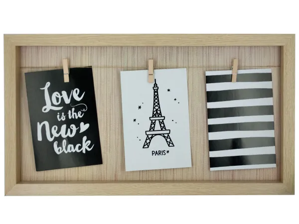 Showcase three of your favorite images with this unique Beige Clothesline Photo Frame featuring a composite wood box frame with a light brown wood veneer covering, a twine line with three mini clothespins for holding photos and a woven bamboo background. Accommodates three photos up to 4" x 6". Back of frame has metal sawtooth brackets for wall mounting. Measures approximately 17" x 9.5". Comes shrink wrapped with corner protectors.