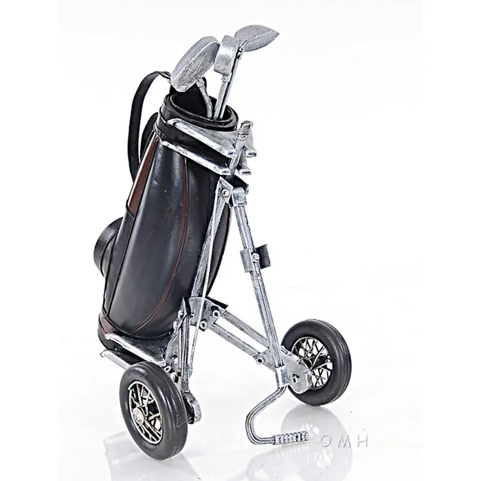 Golf bags on pull carts help the golfer or golf caddy distribute the weight so that it can be rolled rather than carried. This golf bag is versatileit can be used as dcor or even used as a pen holder, with the pens sitting with the clubs. The metal wheels also roll as you pull the cart with the handle. Also, the handle is on a hinge which allows the cart to be positioned in several ways if desired. This memorabilia is 100% iron frame; like all of our models, no plastic parts have been used. The model is handmade as well as painted for a more vintage look.100% iron frame