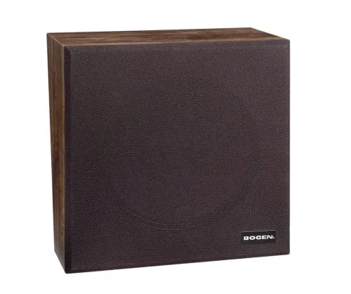 The Bogen Wall Baffle Speaker is designed for easy installation in a variety of settings. It features an 8" cone speaker housed in an attractive simulated walnut-finished wooden enclosure, complemented by a stylish black grille cloth on the front.