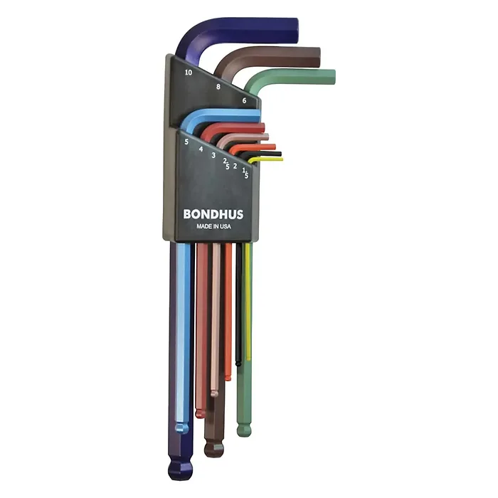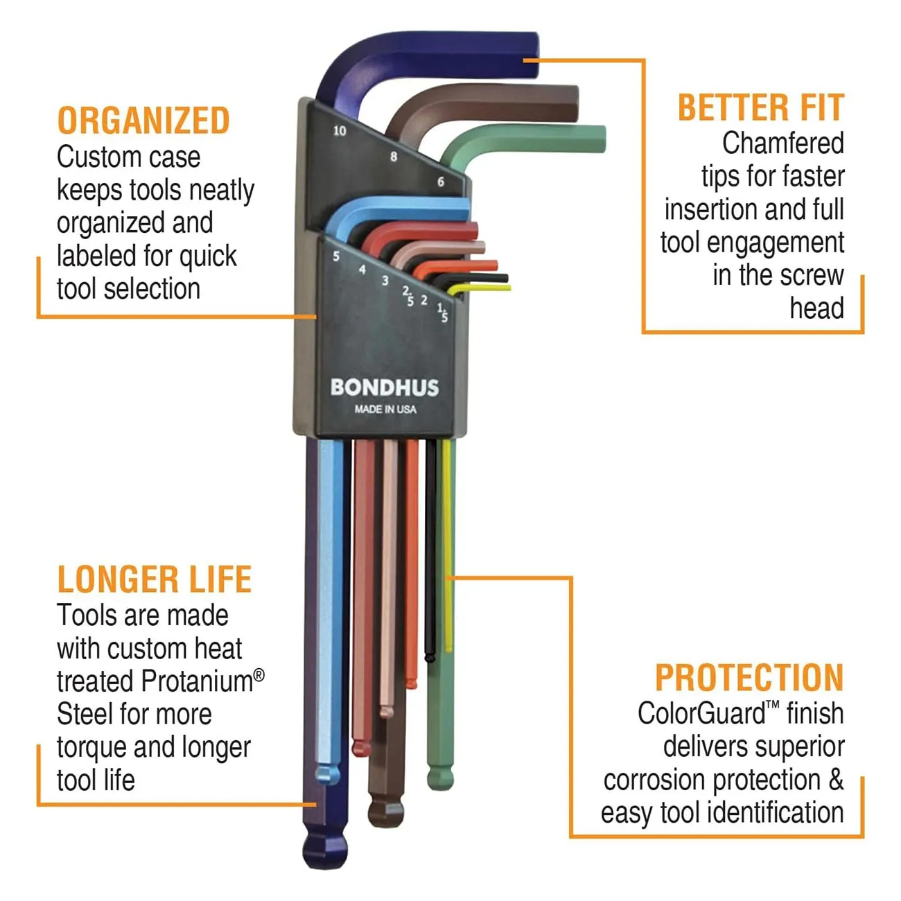 The Bondhus ColorGuard Plated Balldriver Metric Ball End HEX L-Key Set includes 9 precision-engineered hex keys designed for optimal performance and durability. Each key features a unique ColorGuard plating that not only enhances visibility but also provides enhanced grip for easy handling.