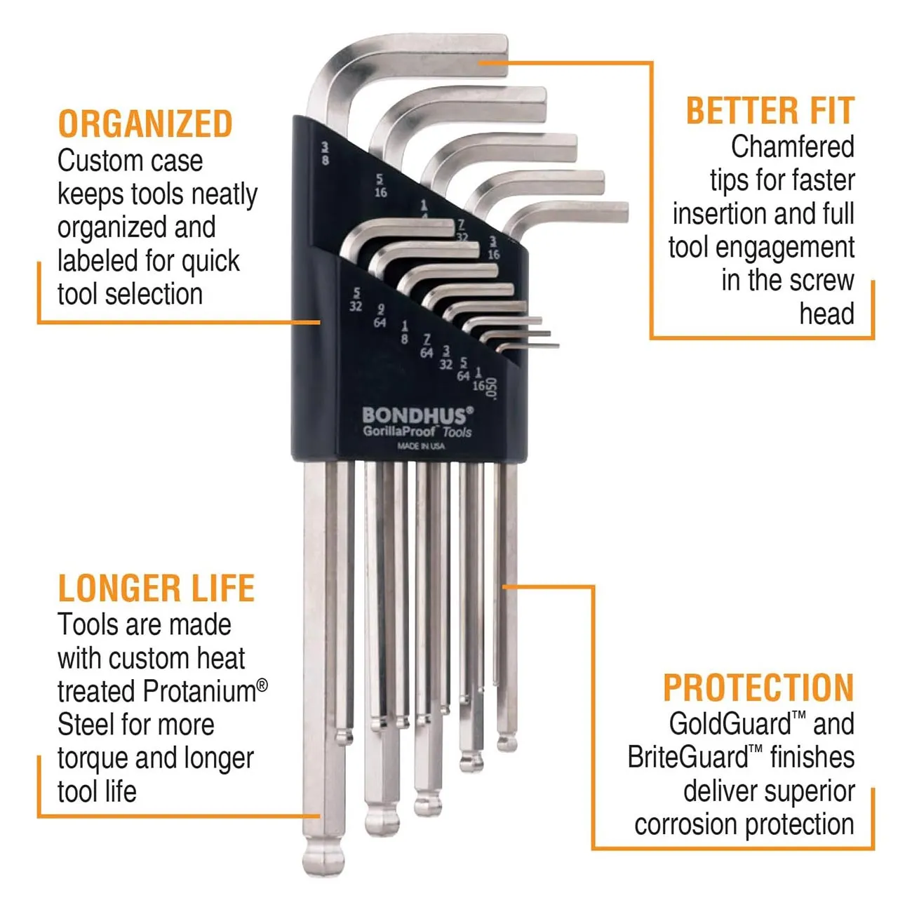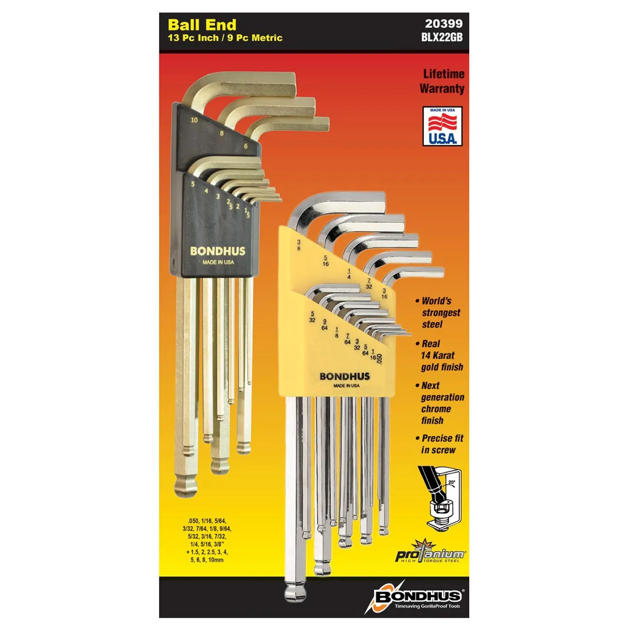 The Bondhus 20399 is a set of Metric and SAE ball end hex L-keys. These GorillaProof tools are made in the USA.