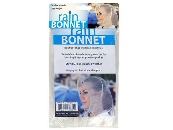 Bouffant Style Rain Bonnet. Comes packaged in a poly bag with a header card.
