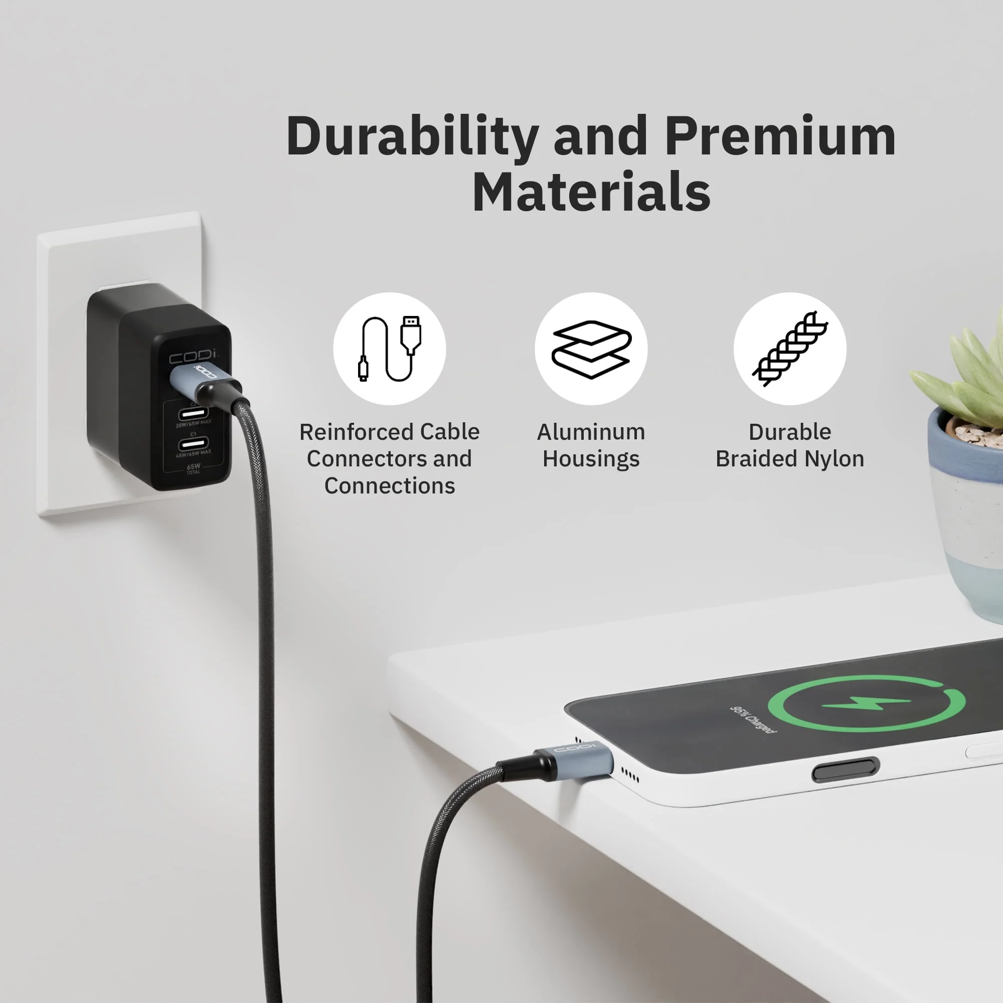 - Durable braided nylon exterior